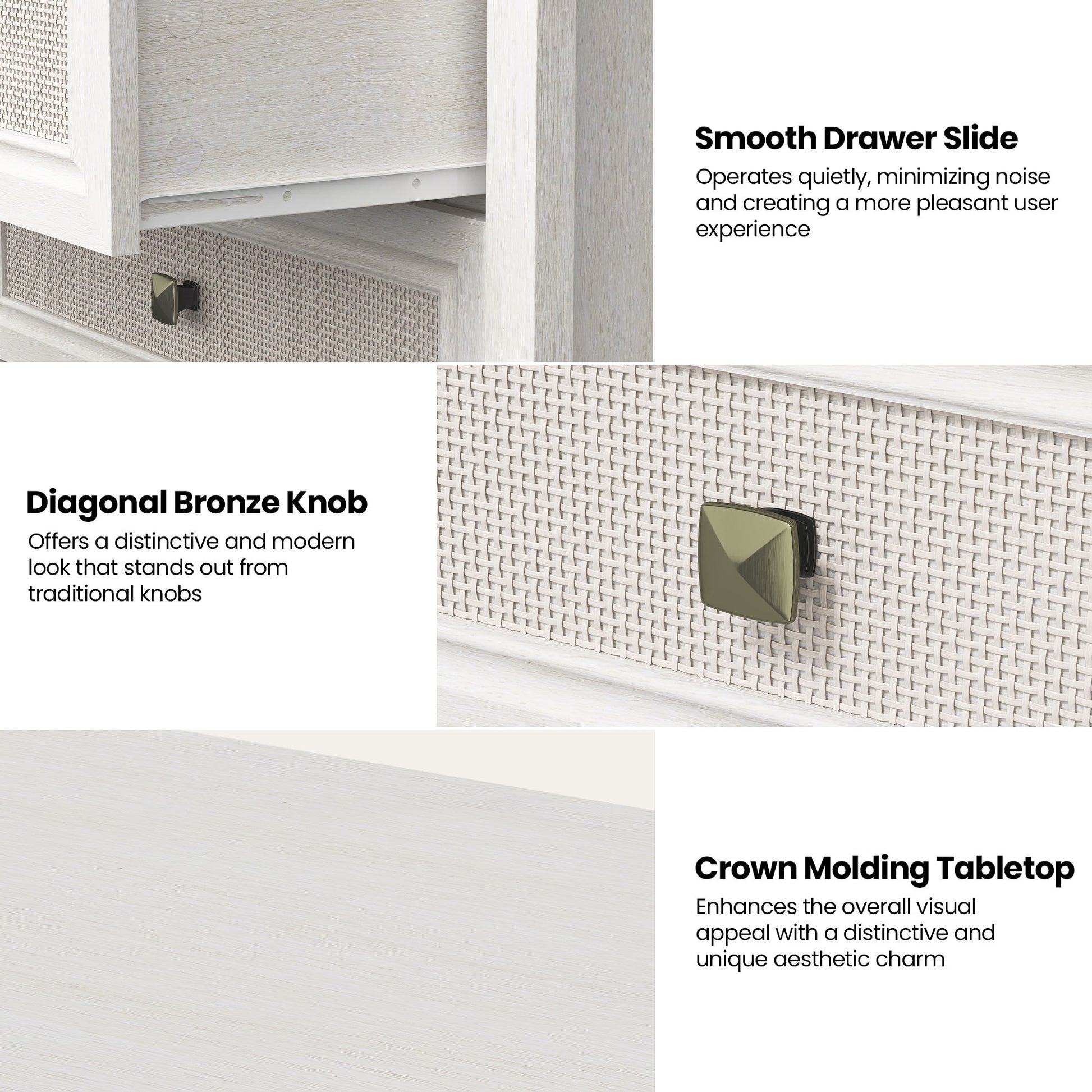 Elegant Rattan Design: Crafted with wood grain panels and accented by natural rattan, the bedroom nightstand shows a charming boho-chic vibe. With diagonal bronze knobs for a unique look, it adds warmth and organic elegance to any space.