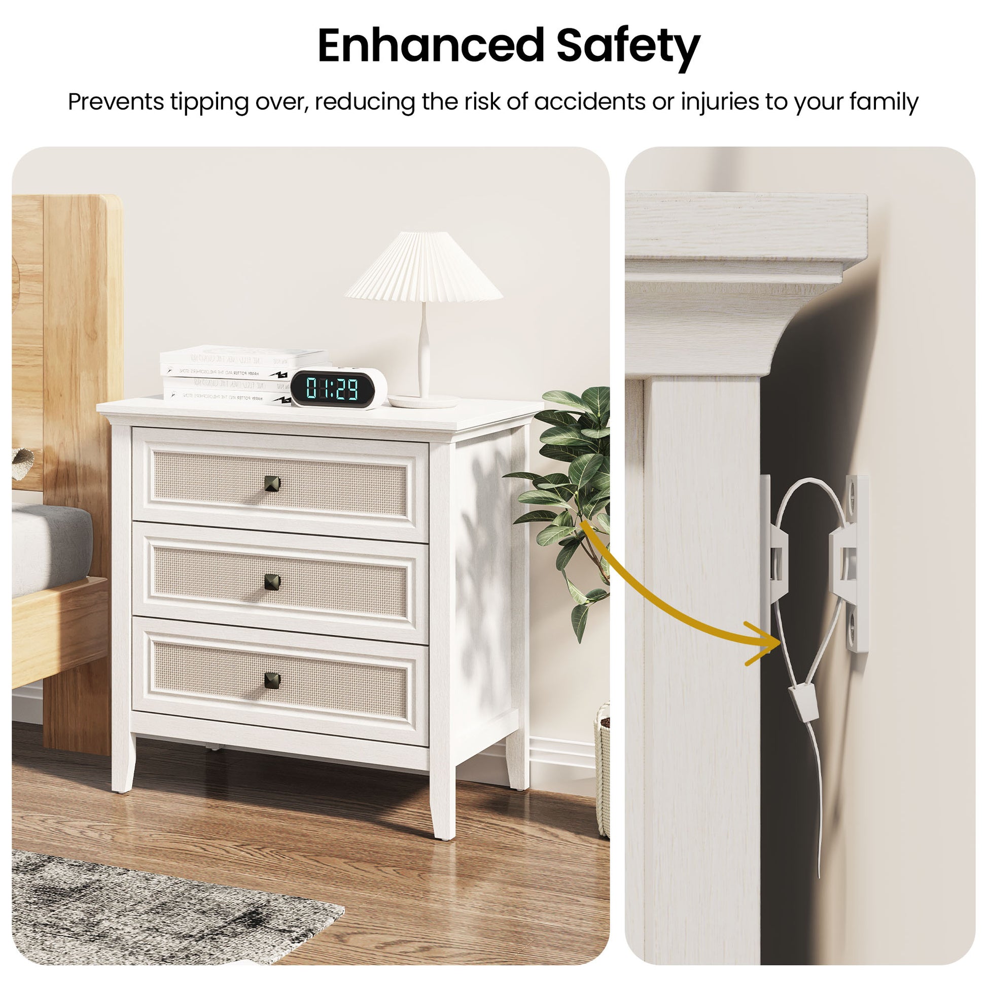 Robust Material: This rattan cabinet features sturdy P2-grade MDF material which ensures safety and durability, while the natural rattan adds breathability. Safety is ensured with an anti-tipping design, while anti-slip foot pads protect floors