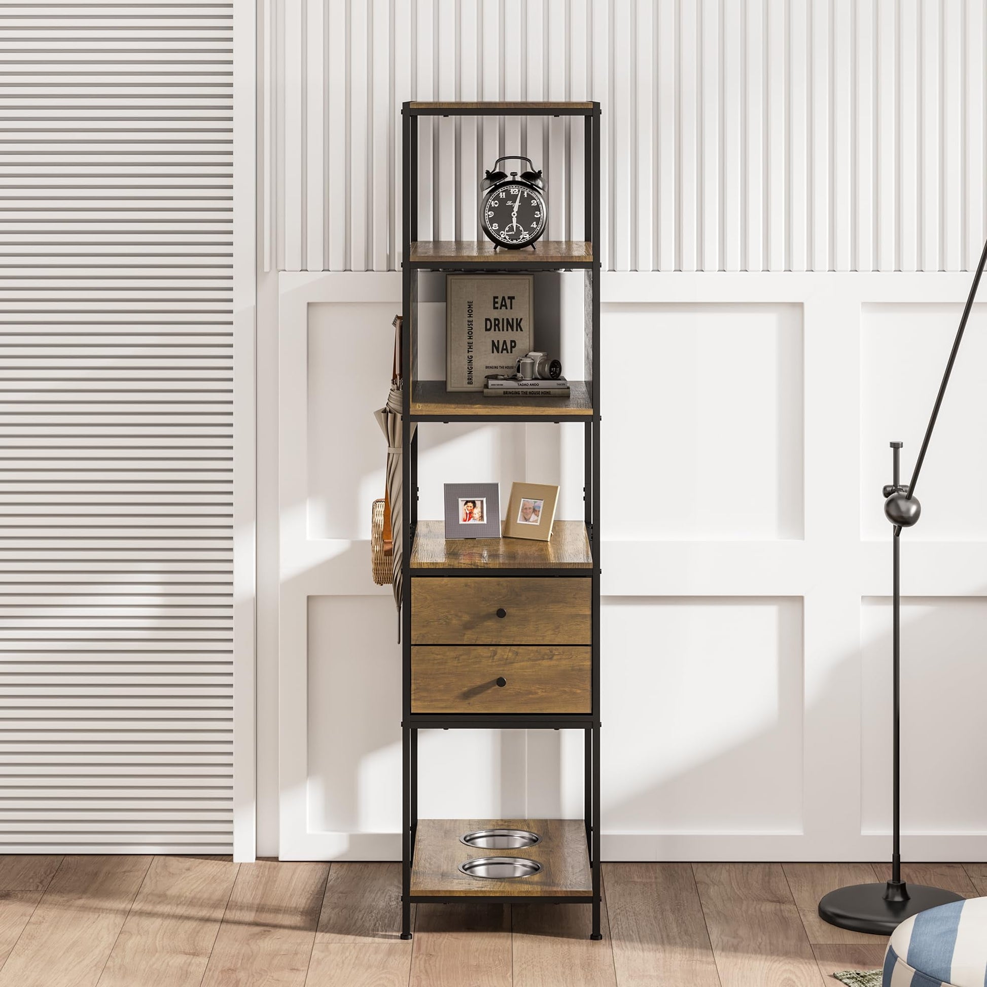 CozyHome Industrial Bookshelf, Standing Display Shelf with 2 Dog Bowls, Metal and Wood Bookshelf, Dog Feeder Station with Shelves, Brown