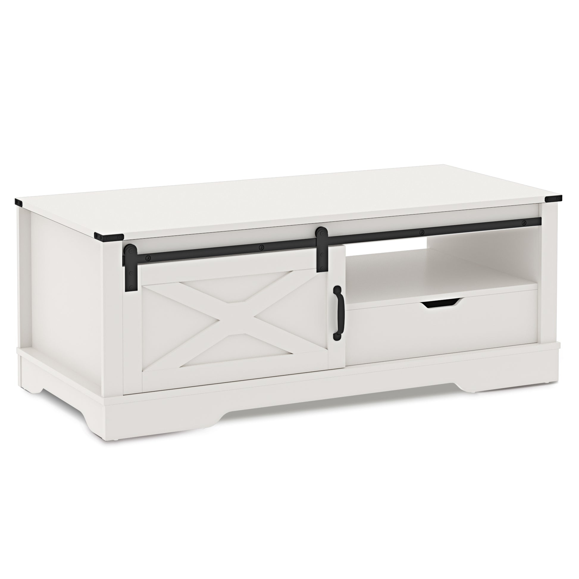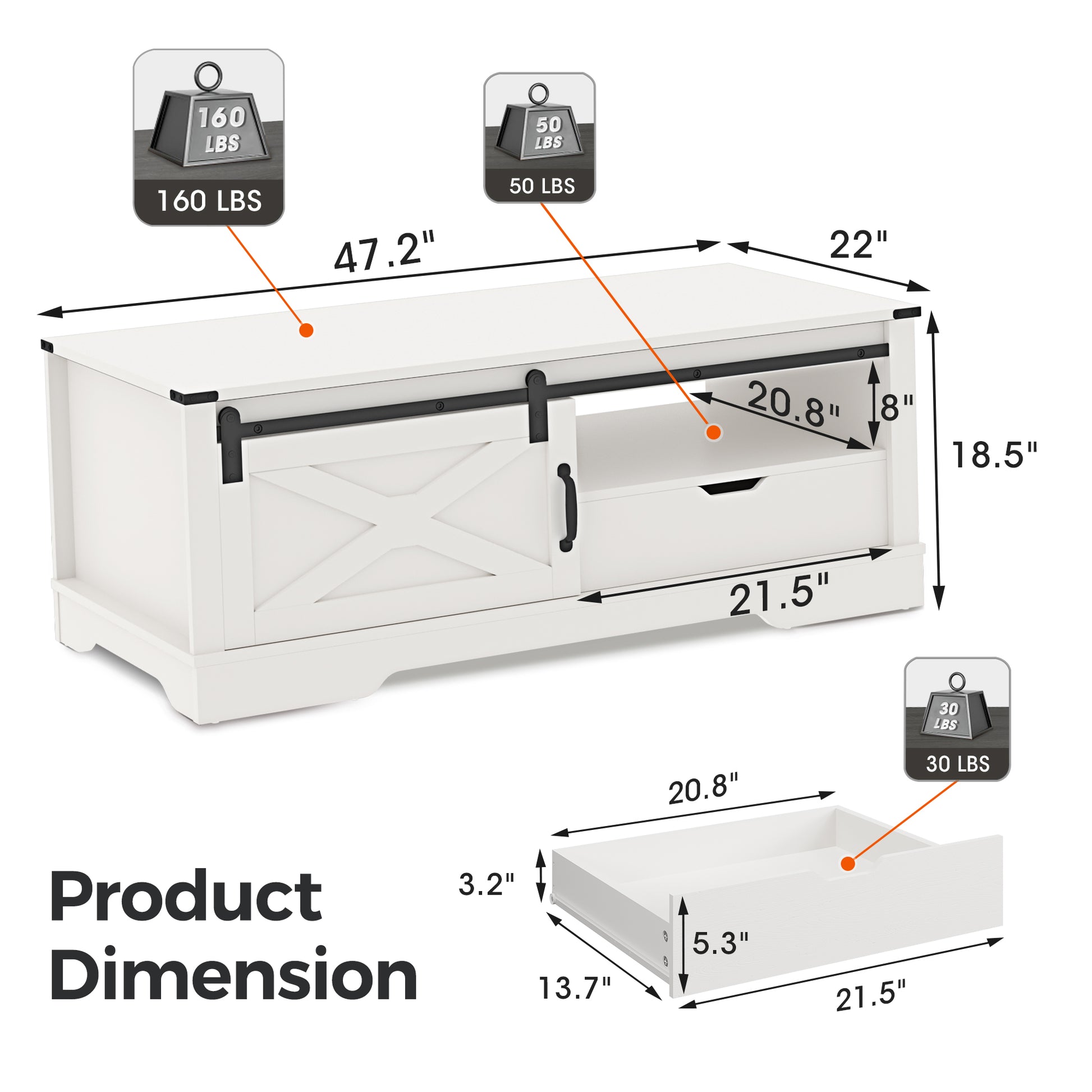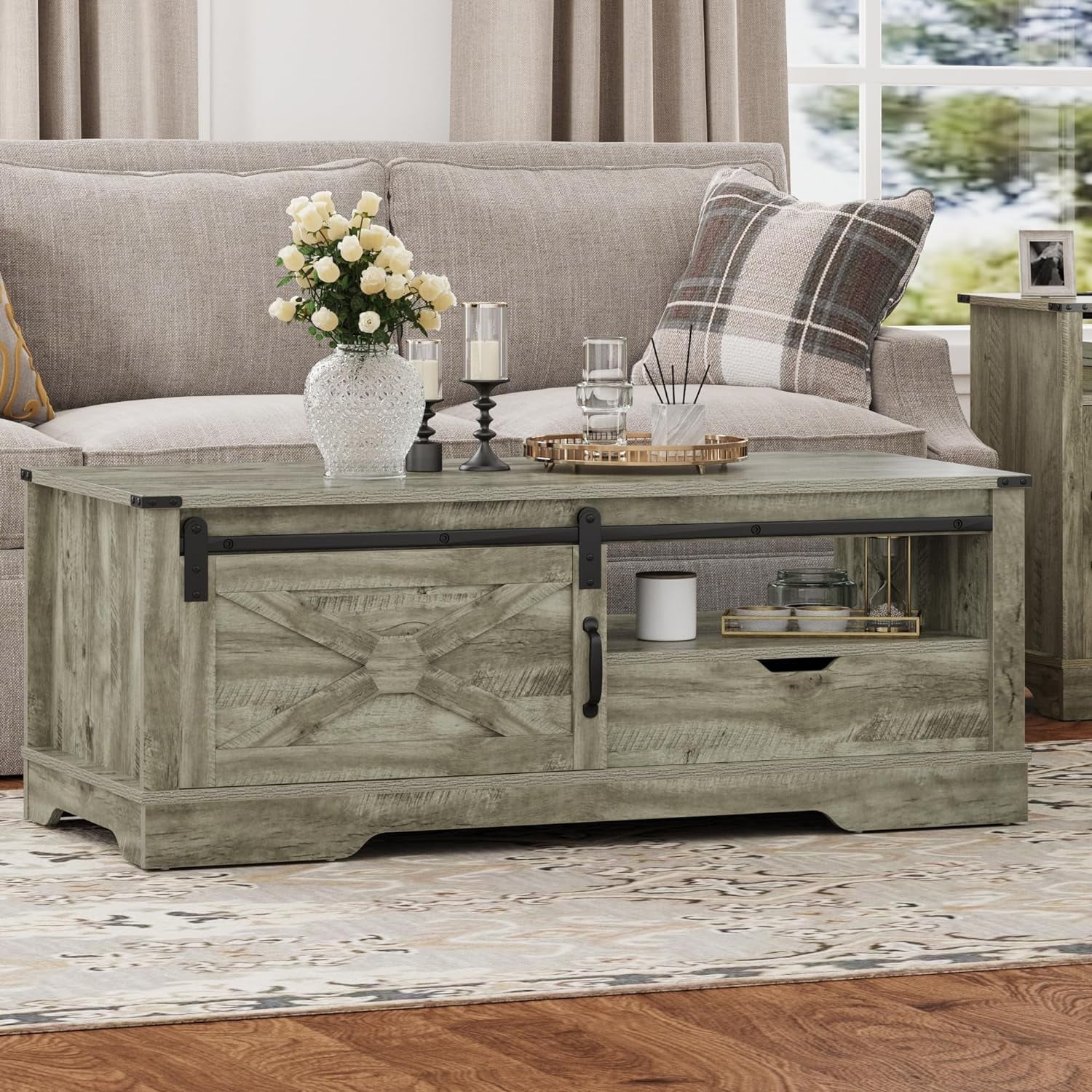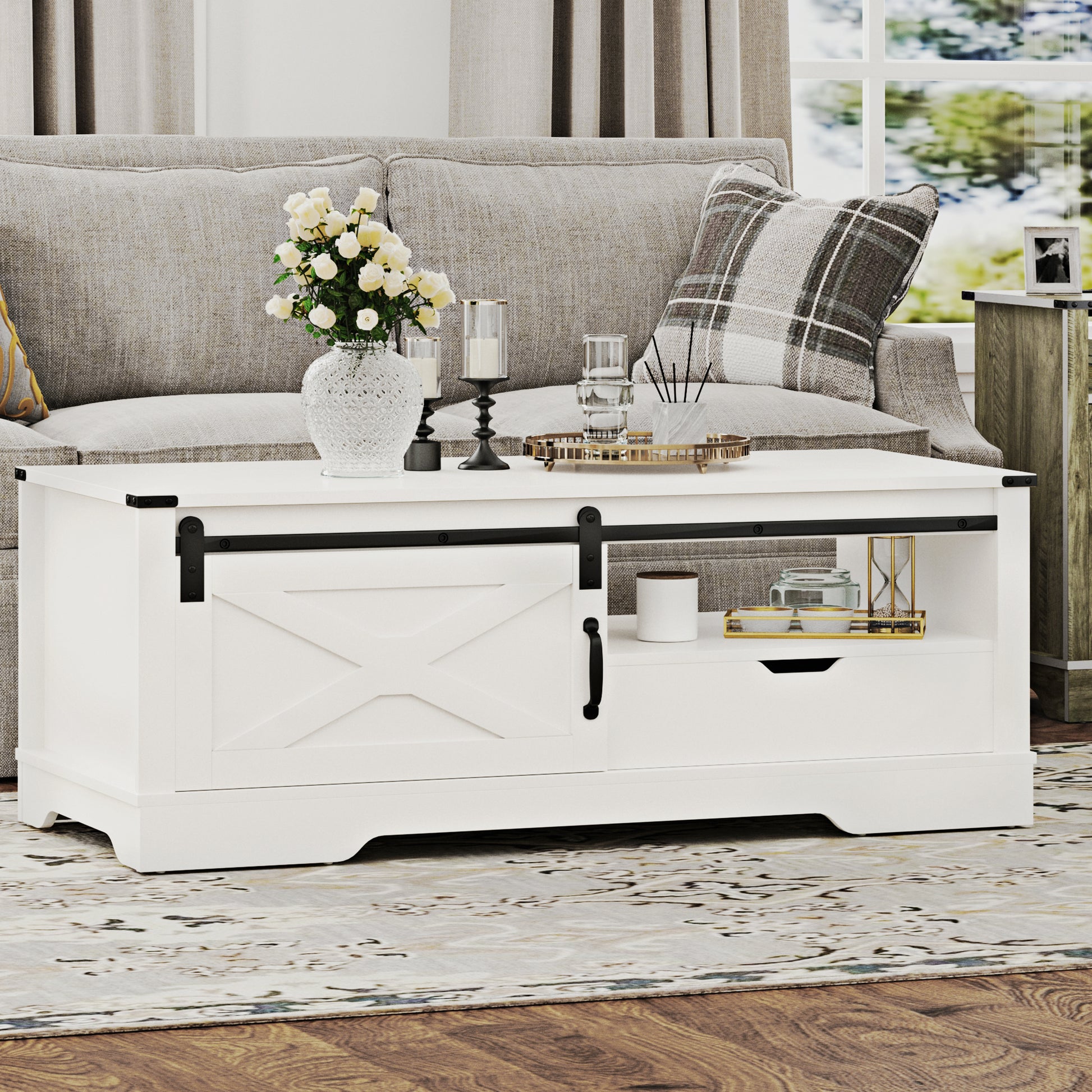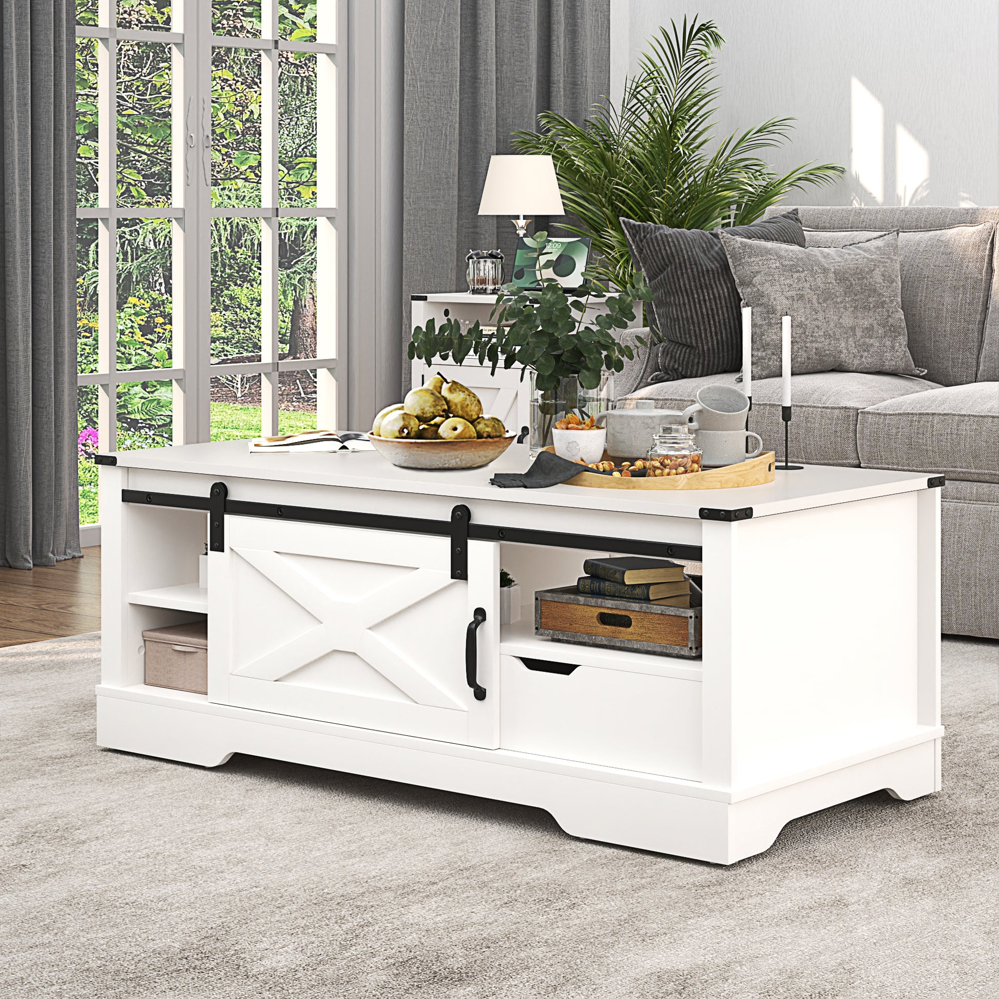 Farmhouse Coffee Table with Storage and Sliding Barn Door, 48'' Rustic Living Room Table , Rectangular Center Table