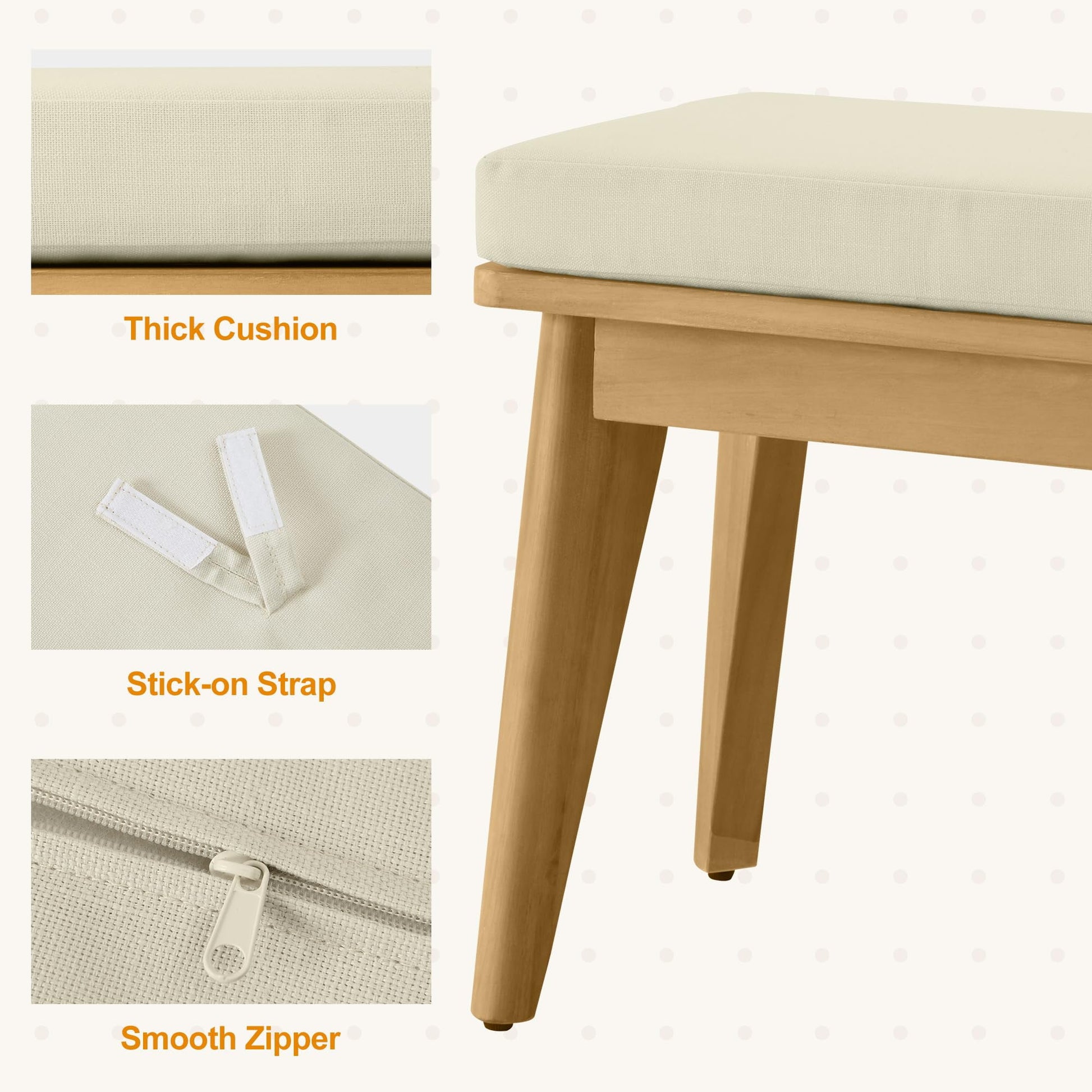 - Built To Last: Crafted from high-quality acacia wood, this bench offers superior durability and longevity. Its all-weather design makes it ideal for outdoor use year-round. The plush 2.36-inch thick cushion is resilient, providing a comfortable seating experience that lasts.