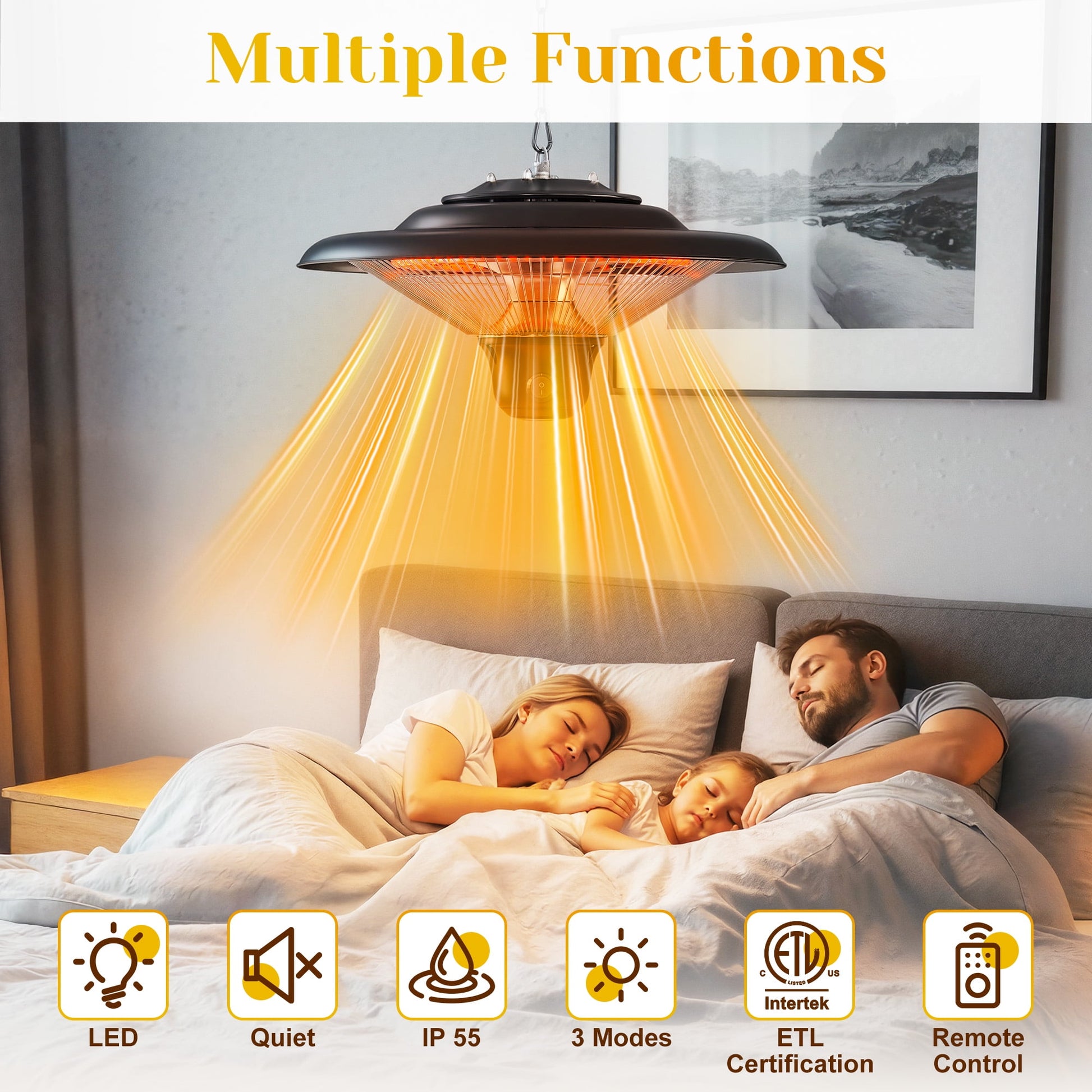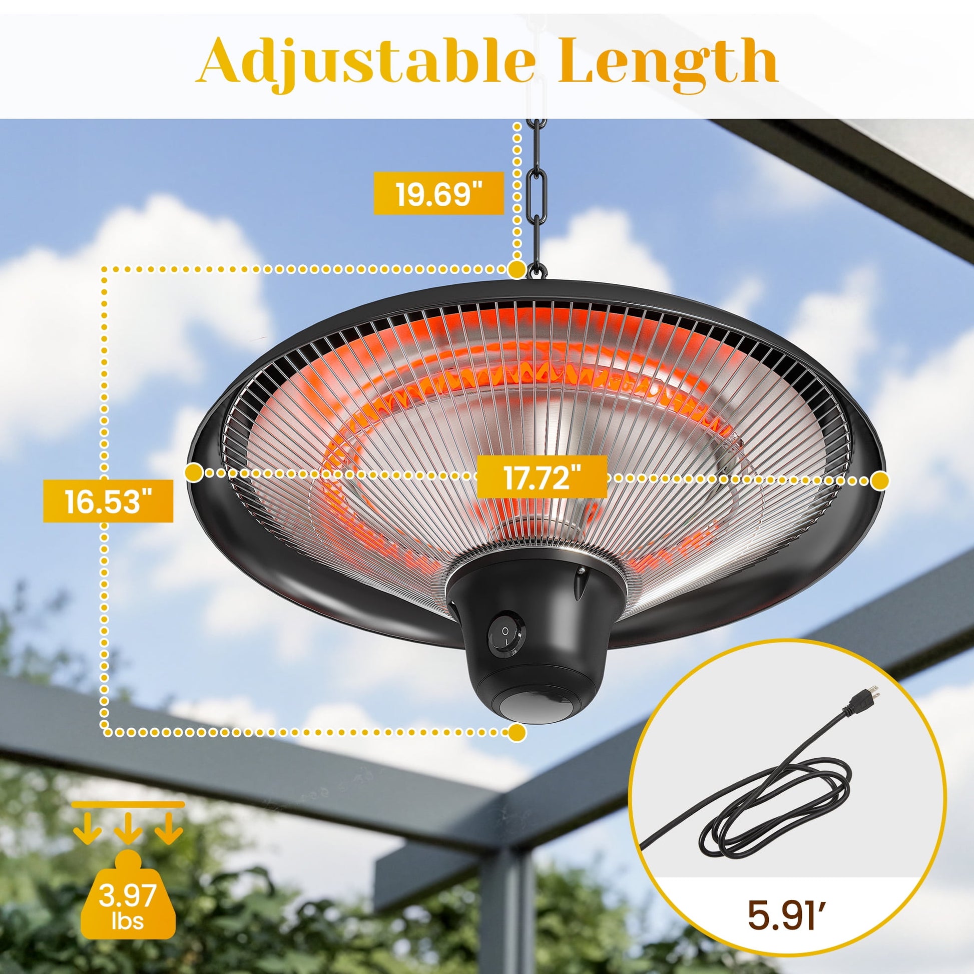 Bring warmth and comfort to every outdoor moment with this 1500W carbon infrared patio heater. Whether it¡¯s a crisp morning coffee on the terrace, an evening gathering under your gazebo, or a cozy night in a camping tent, this heater delivers fast, silent, and smoke-free warmth without drying the air. The adjustable chain and built-in hook make hanging simple and flexible, while remote and manual controls let you fine-tune the heat effortlessly. A soft LED light adds a warm glow to your evenings, creating the perfect ambiance. Lightweight, portable, and IP55-rated, it¡¯s ideal for backyard barbecues, family gatherings, or relaxing solo nights outdoors¡ªenjoy comfort anytime, rain or shine.