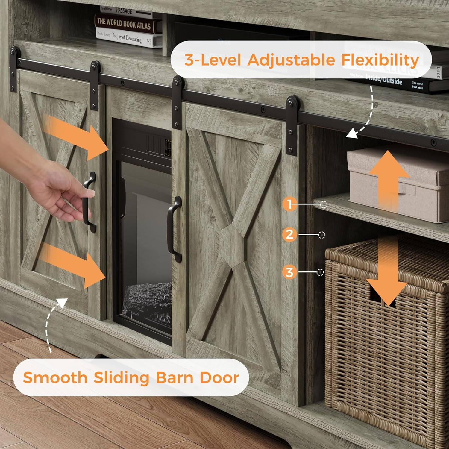 Mayincolor Fireplace TV Stand for 65"+ inch TV, Farmhouse Entertainment Center with 23" Electric Fireplace with Remote, Modern Rustic TV Console Storage Cabinet with Sliding Bar Door , Light Grey