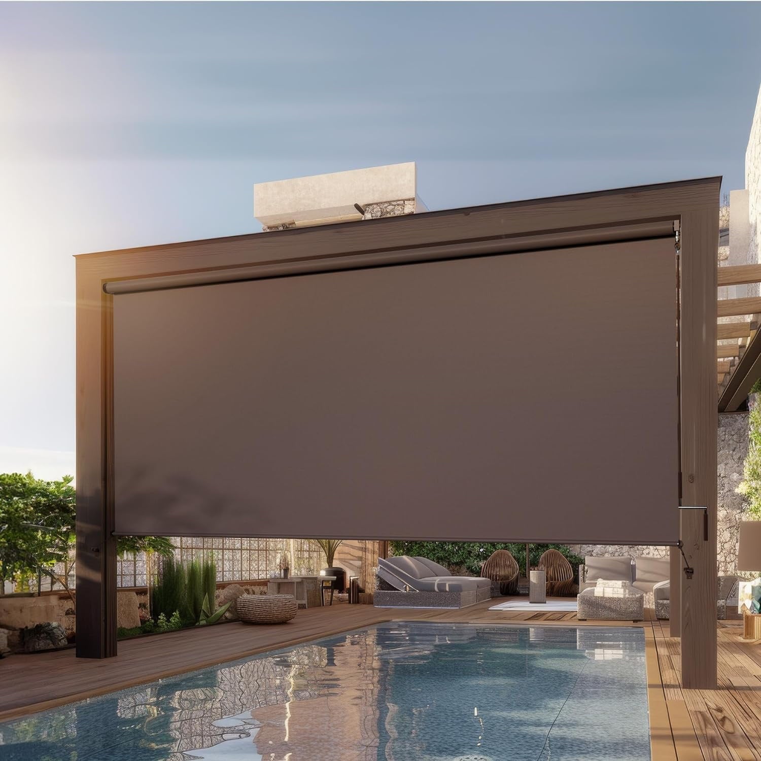 Different from ordinary outdoor shade, our outdoor shade material is upgraded, which is made of 70% PVC & 30% Polyrster's Teslin Fabric. It has excellent ultraviolet effects and can block 95% of UV. At the same time, Teslin Fabric has a good breathability, you will never feel sultry. In addition, the excellent production technology makes this outdoor roller shade have an excellent windproof effect, can effectively prevent the stimulation of wind and sand.
