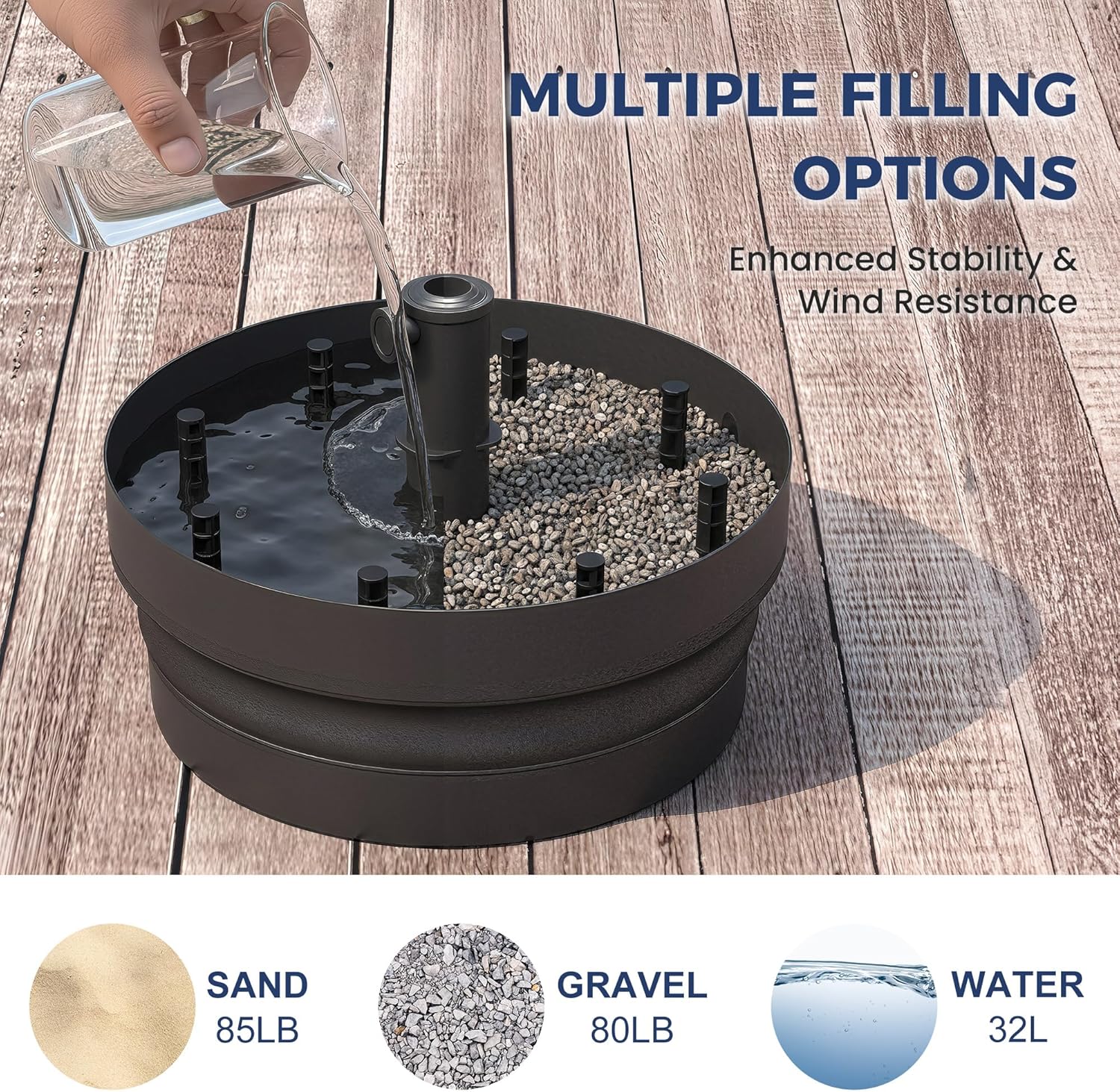 Umbrella base, patio umbrella base, outdoor umbrella base, umbrella stand outdoor base, patio umbrella bases, outdoor umbrella stand, outdoor umbrella stand base, umbrella base stand, umbrella base outdoor patio, base for patio umbrella, clearance patio umbrella base, patio base, weighted umbrella stands, heavy duty umbrella base, umbrella base stand outdoor, base for umbrella, free standing umbrella base, base for umbrella outdoor patio, water filled umbrella base, portable umbrella base, Heavy Duty Market Stand for Patio, table umbrella base, unbrella base, umbrella base water filled, umbrella stand, patio umbrella stands & bases ADAPTABLE FILLER: Umbrella base can be reinforced with up to 85lbs sand or 32L water and 80lbs gravel providing(Not included), extremely high stability and stronger support. Add once for long-term use ADJUSTABLE DESIGN: Features an adjustable knob for easy adaptation to umbrella shaft diameters ranging from 1.26''-1.89''. The weighted umbrella base delivers optimal strength and stability EASY TO FOLD & STORE: The lightweight folding design makes the table umbrella base easy to carry, weighs only 7.7lb when emptied folds to 2.7'' height. It fits perfectly into tight spaces during winter or off-season CLEAN & REFINED LINES: The heavy duty base features a unique decorative texture and glossy black coating, seamlessly complementing any outdoor setting. Made from HDPE material, it resists rust, UV rays, and water WIDELY USED: HDPE umbrella base is perfectly suited for patio, gardens, cafes, and commercial spaces. Compatible with umbrellas ranging from 6 to 13 feet, they create a stunning landscape feature