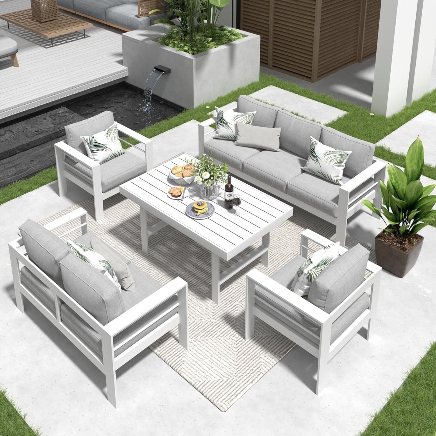 RoyalCarft Aluminum Patio Furniture Set,5 Pieces Modern Outdoor Conversation Set Sectional Sofa with Upgrade Cushion and Dining Table, White