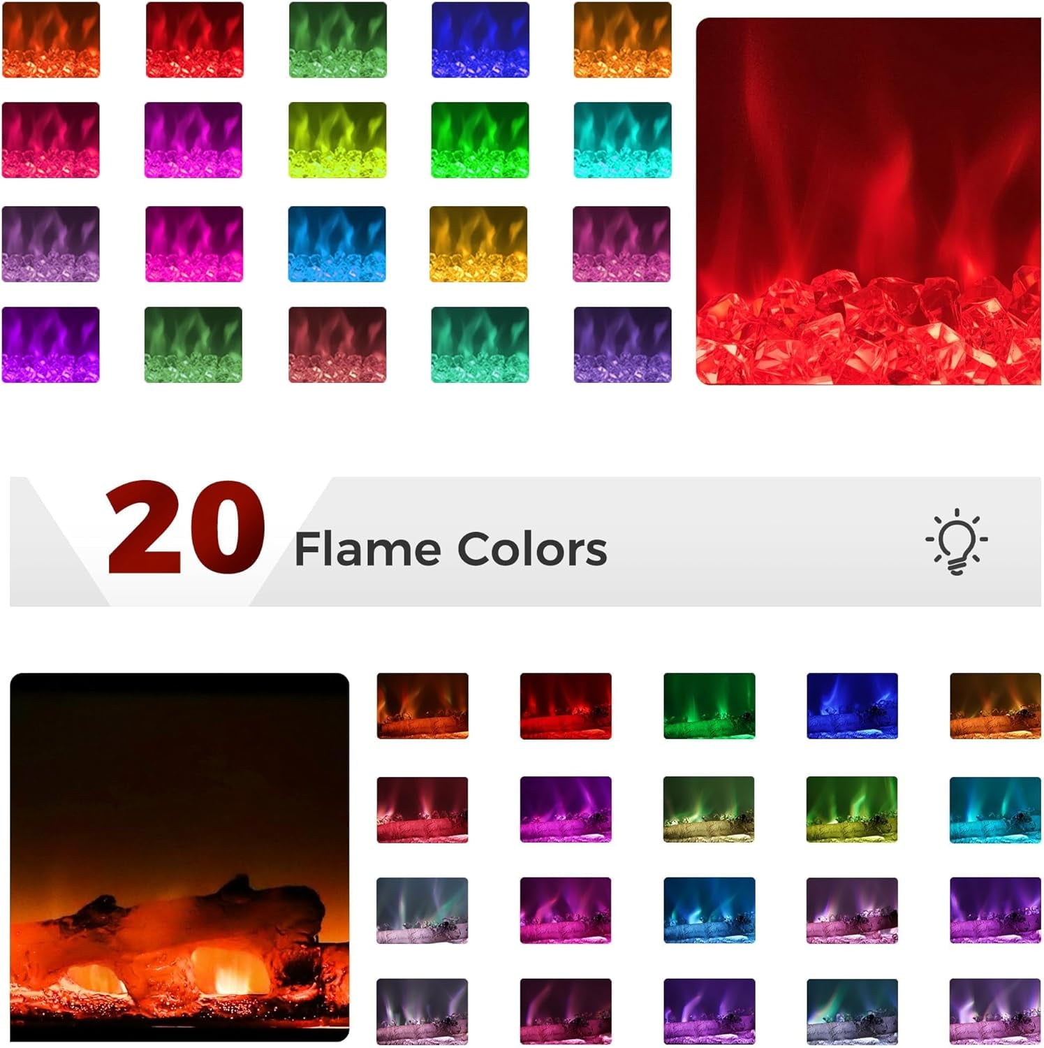 - Realistic Flame Effect:The crystal stones and fake firewood interior can be freely interchanged according to your preference. Our high-intensity LED lights, with a large display, allow you to enjoy 20 captivating flame hues and adjust brightness across 5 levels for the perfect ambiance.