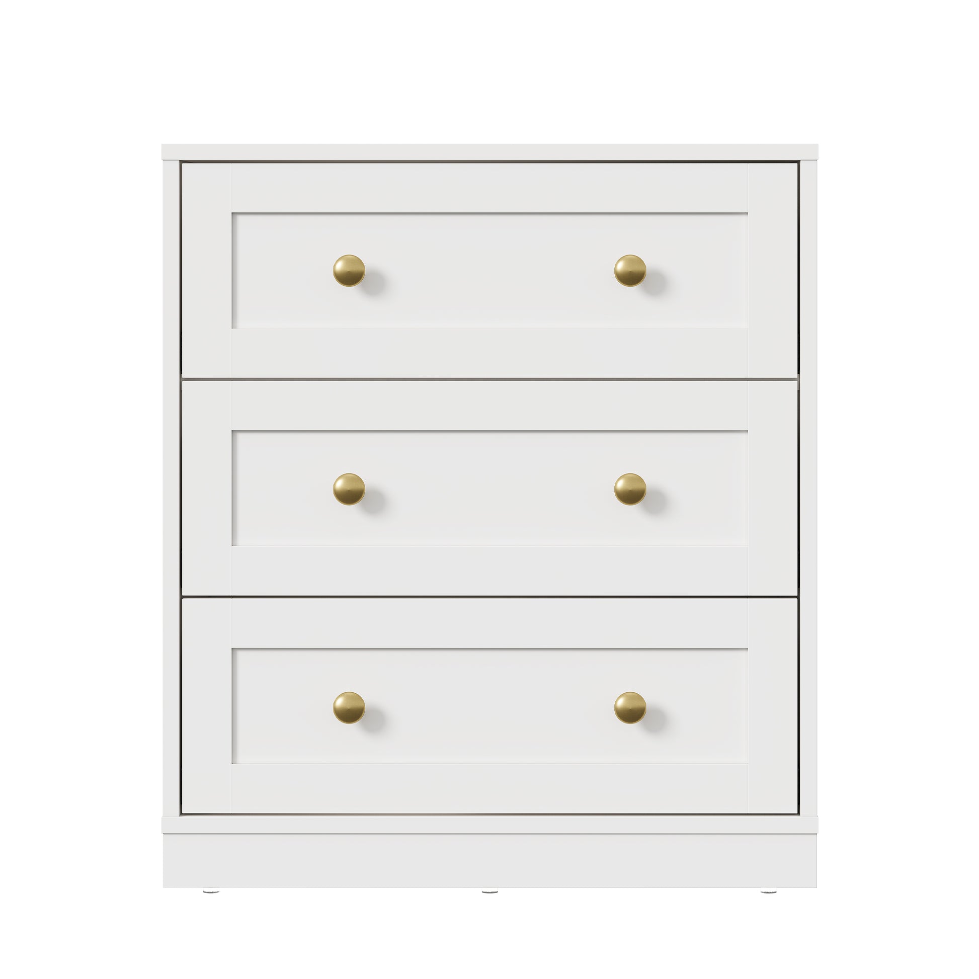This nightstand combines durability and style with its sturdy P2-grade MDF construction, featuring anti-tip hardware and non-slip feet for added safety. Its compact size, 23.62in x 13.78in x 26.97in , makes it perfect for tight spaces like the bedroom or living room. With 3 spacious drawers and a spacious top, it's ideal for organizing essentials or displaying decor. The sleek white finish and gold knobs add a touch of elegance, making it a stylish and practical addition to any room.