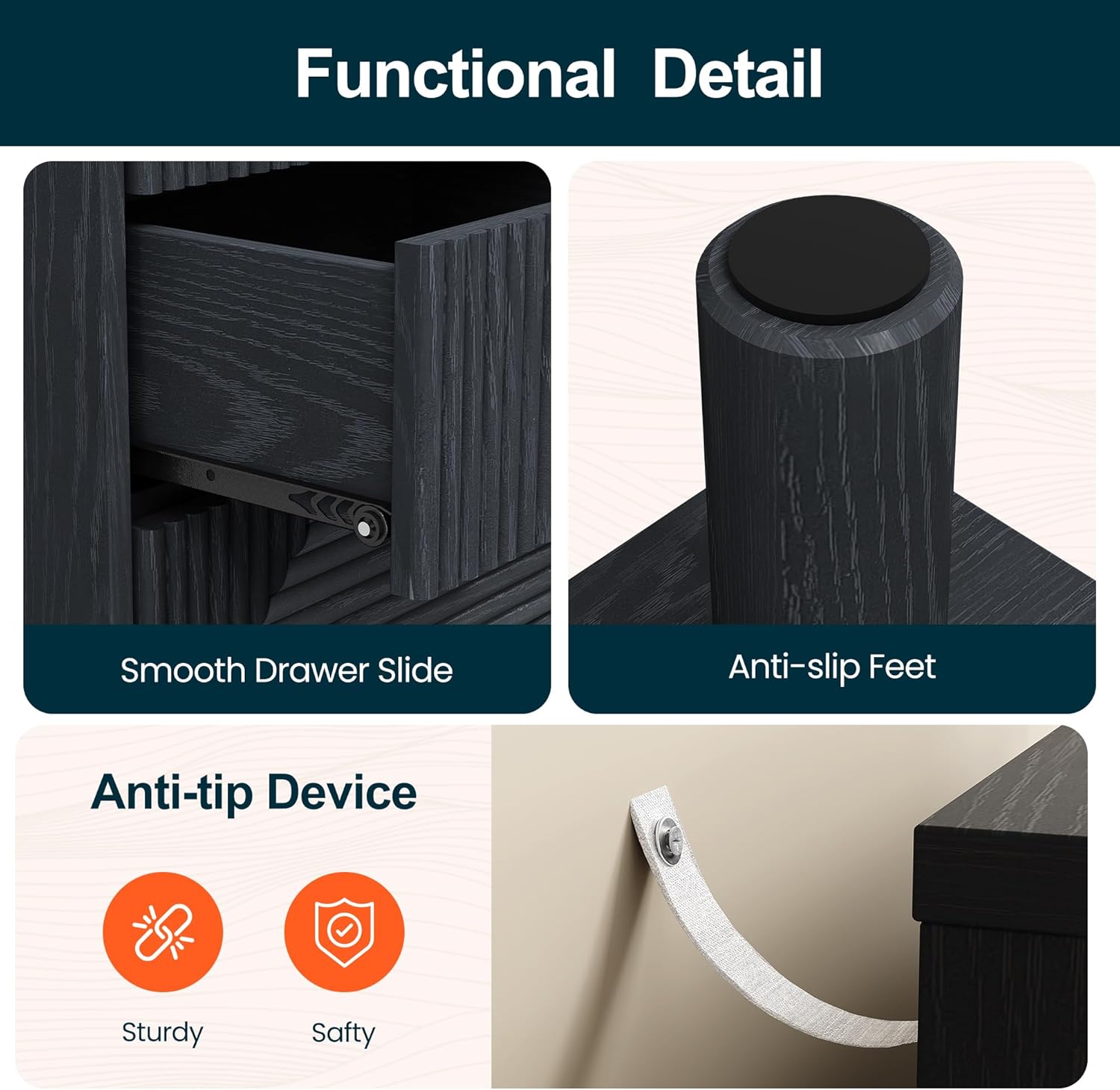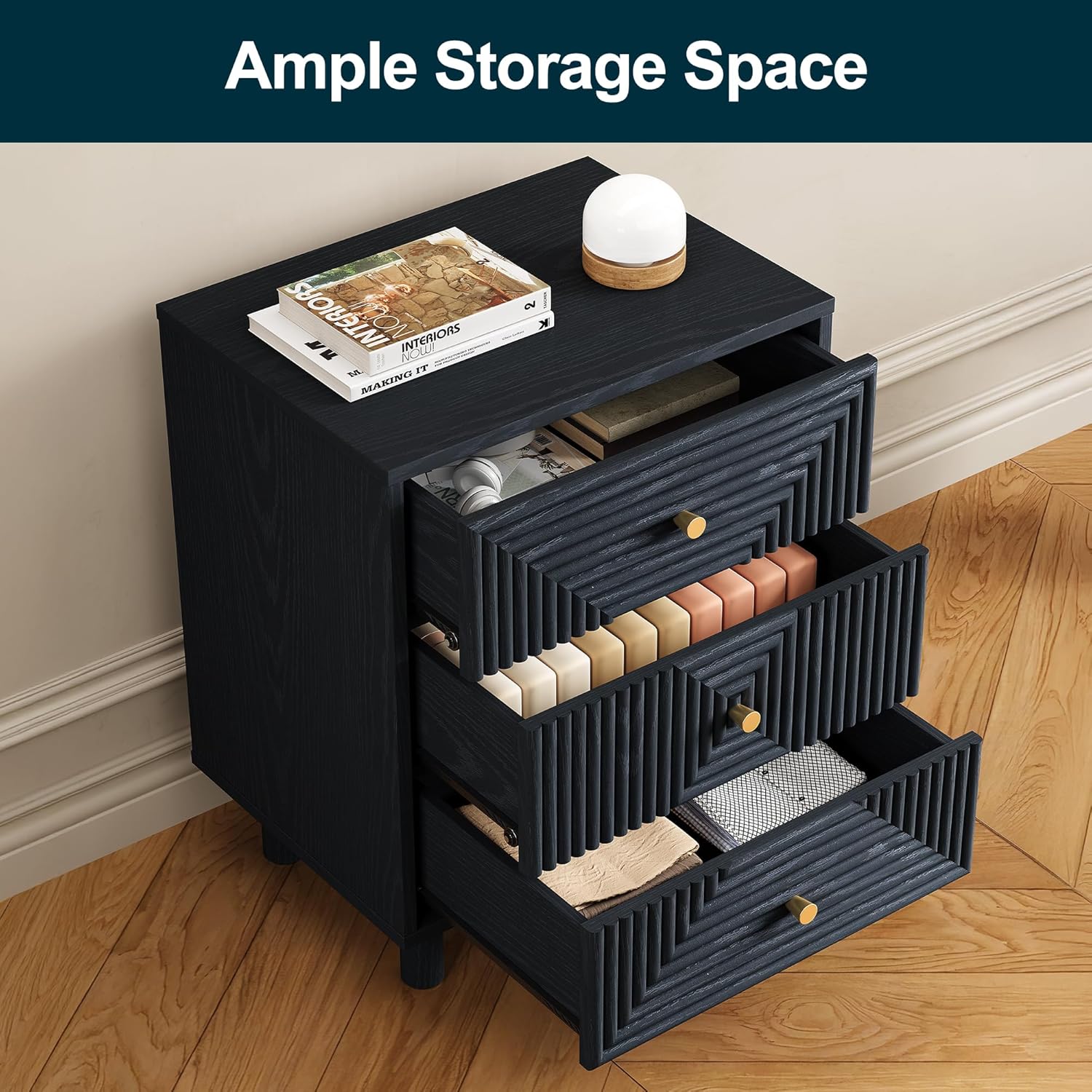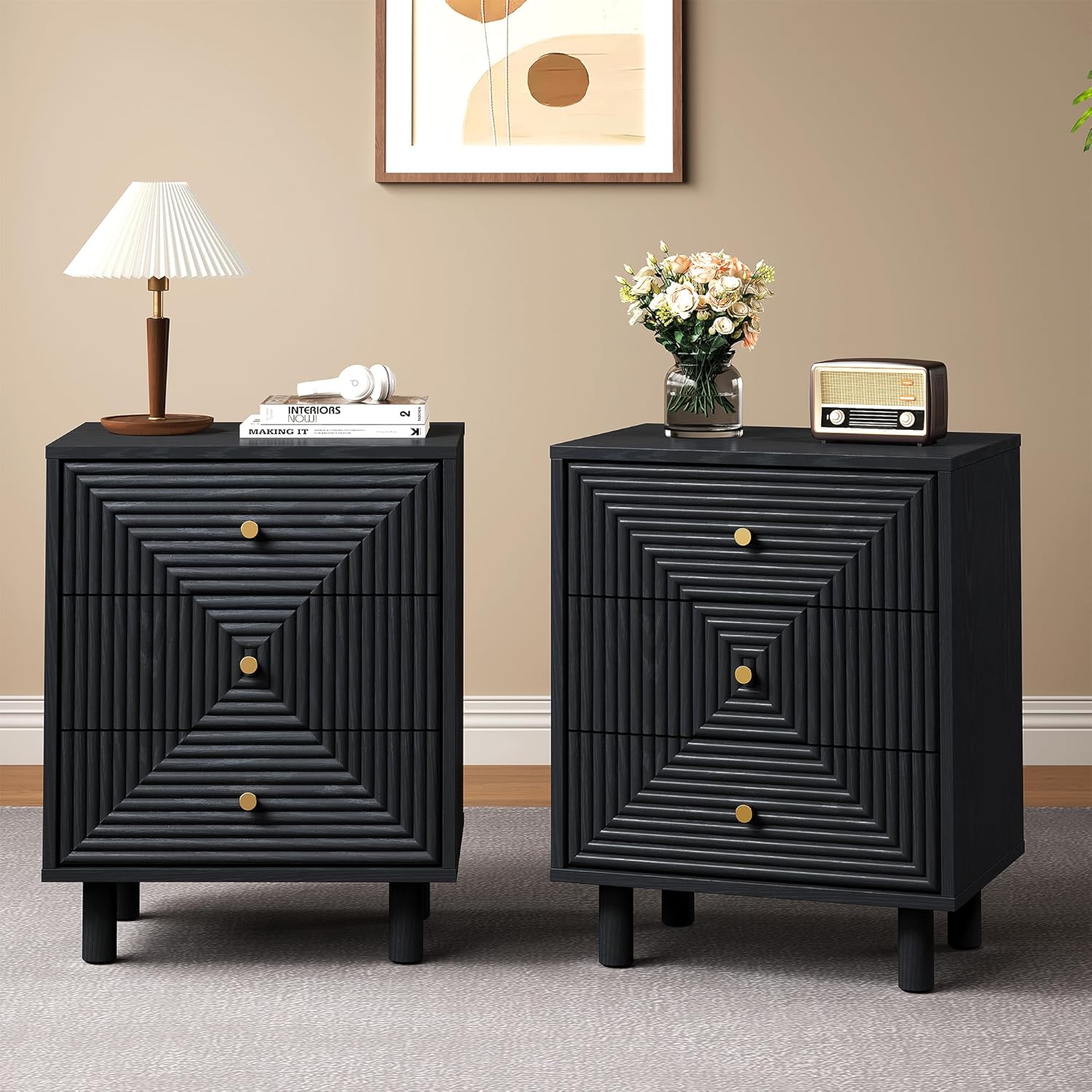 Sleek & Stylish: This nightstand comes in a black finish with elegant wood grain, exuding a refined modern charm. Together, the three drawer fronts form a bold concentric square pattern that creates depth and visual impact, while a gold knob lends a hint of luxury. Supported by sturdy cylindrical legs, it combines function with sophistication, making it a stylish addition to any room.Storage Master: This dresser storage unit,offers ample storage with 3 roomy drawers. Keep your clothes, jewelry, accessories, and cosmetics neatly organized and easy to access. The waterproof top provides extra space for lamps, photos, candles, plants, or other essentials. Combining functionality and style, it¡¯s an ideal addition to any tidy home.Sturdy and Safe: Crafted from P2-grade wood, this end table is sturdy and reliable for long-term use. Solid wood legs provide strong support, while anti-slip pads enhance stability and protect the floor from scratches. For added safety, it comes with an anti-tip design to prevent accidental tipping, making it a reliable choice for everyday use.Versatile Use: This uniquely designed bedside table blends practicality with style, fitting effortlessly into bedrooms, living rooms, bathrooms, entryways, and beyond. Use it as a bedside table, kids¡¯ storage unit, closet organizer, entryway solution, or living room display¡ªits versatile functionality keeps clutter at bay and your space tidy. The perfect balance of form and function.Easy Assembly and Cleaning: This large wood nightstand features a smooth, water-resistant surface¡ªsimply wipe away dust with a damp cloth to keep it looking like new. It comes with a detailed instruction manual, making assembly simple. Our support team is available 24/7 to answer any questions, ensuring a hassle-free experience.Share