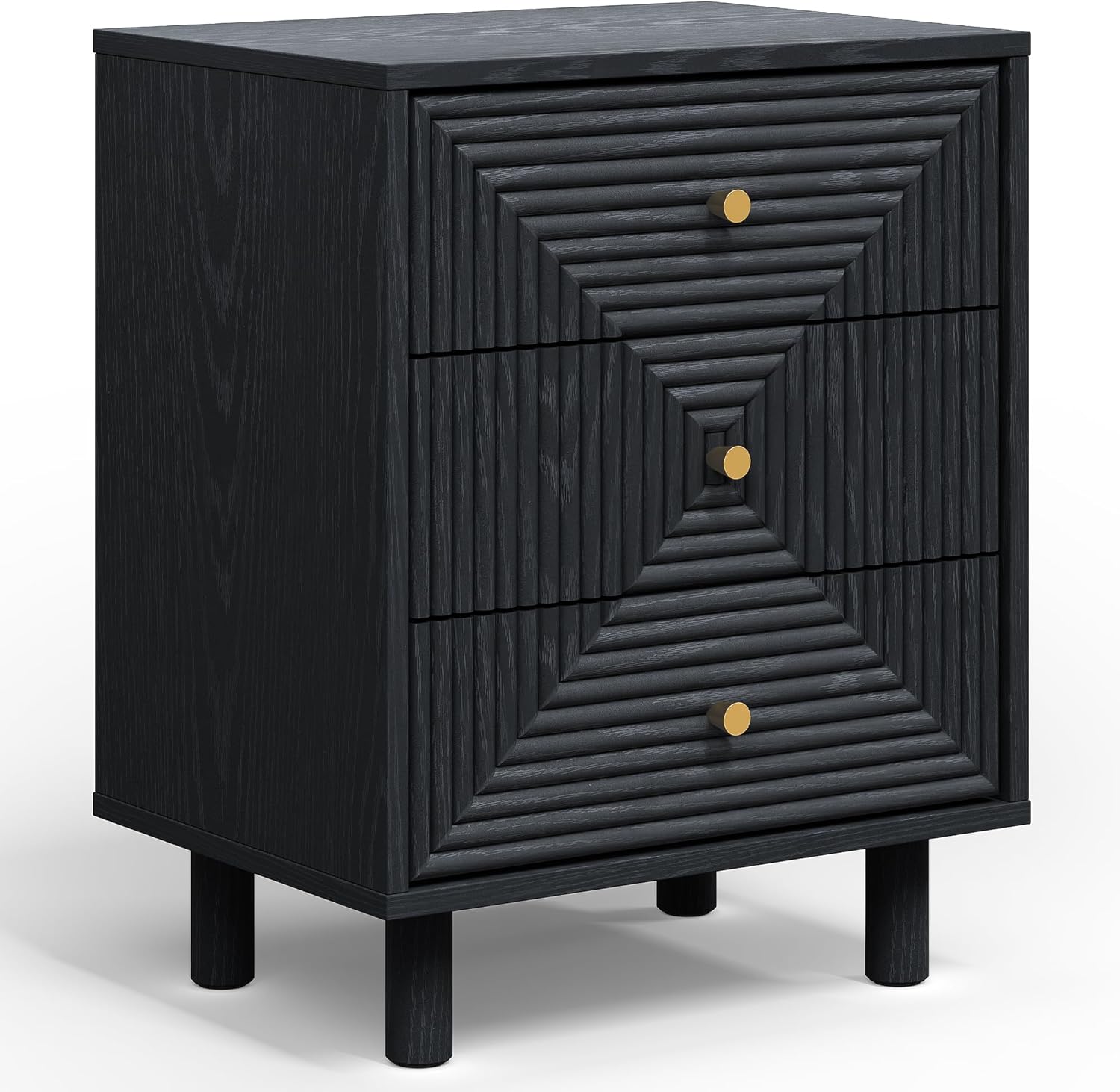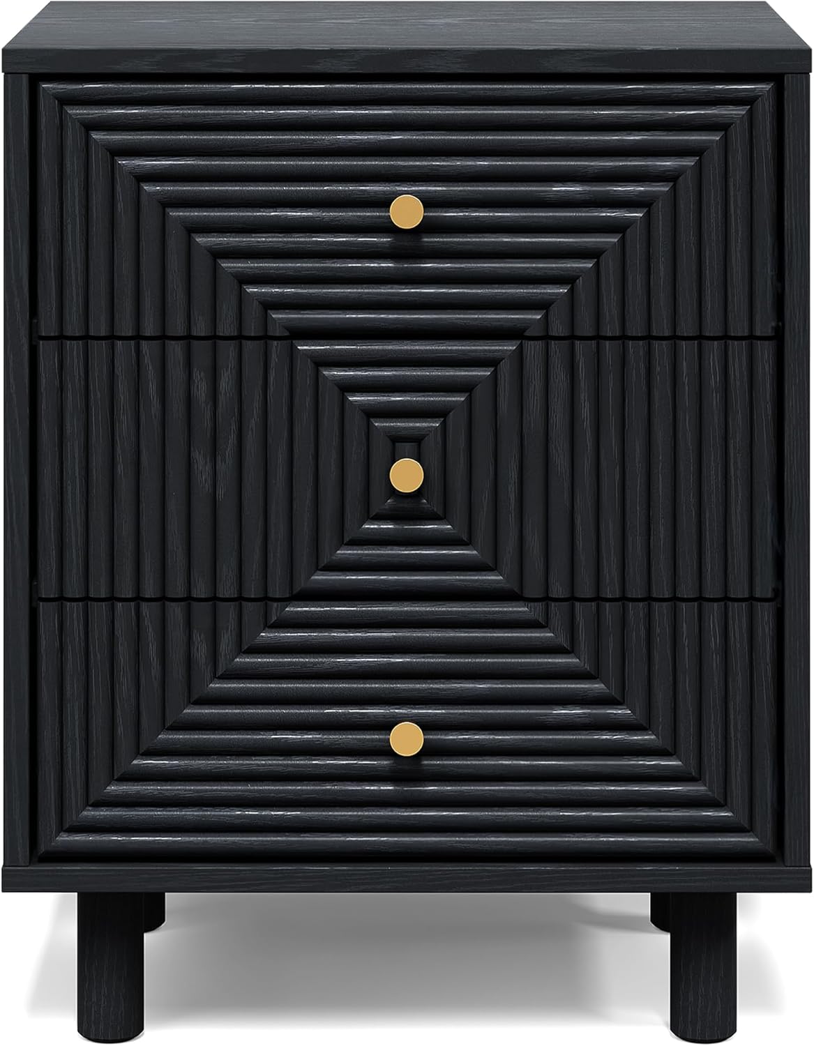 This 3-drawer nightstand combines sleek style with practical storage, making it a must-have for any home. The black finish with subtle wood grain gives this storage unit a refined look, while the three drawer fronts form a striking concentric square pattern accented by a gold knob. Its spacious drawers keep clothes, accessories, and everyday essentials organized, and the waterproof top provides room for lamps, photos, candles, or plants. With sturdy cylindrical legs and anti-slip pads, this dresser organizer offers stable support while protecting floors. Perfect for bedrooms, living rooms, bathrooms, or entryways, it keeps your space tidy while adding style.