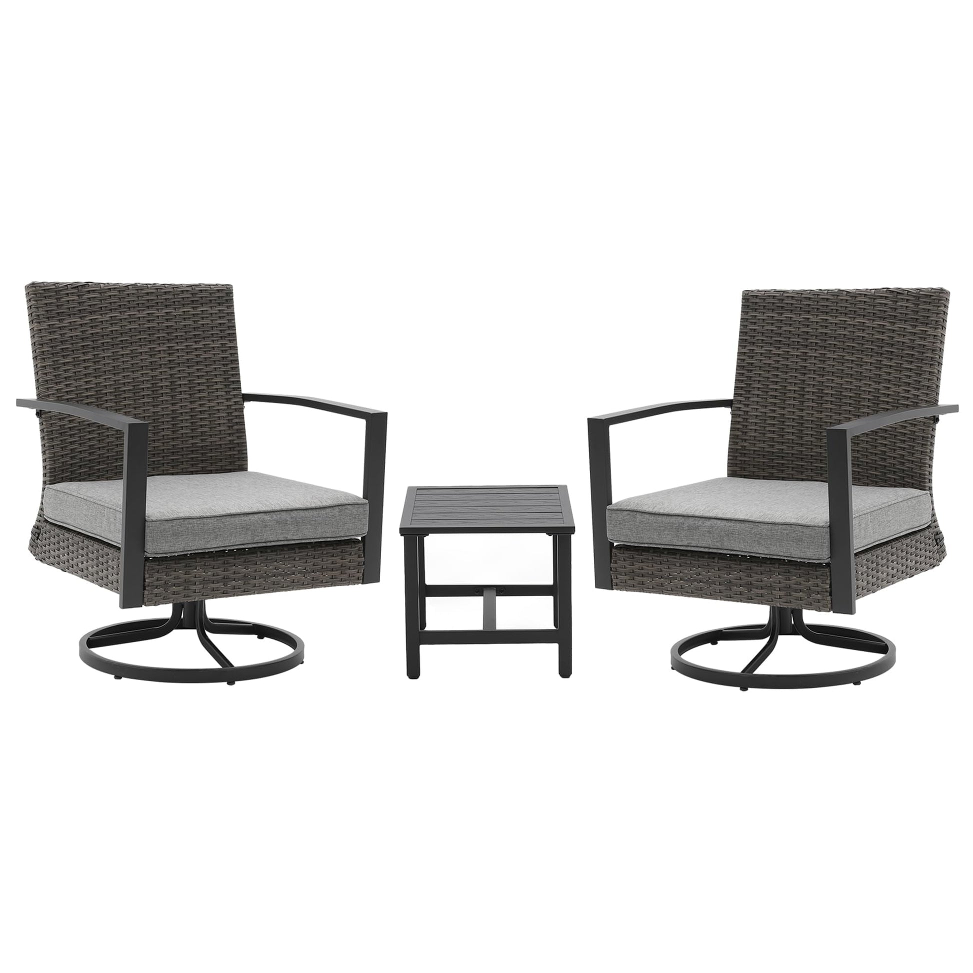 Royalcraft 3 Pieces Patio Bistro Set with Swivel Chair and Small Side Table, All Weather Rattan Chairs with Water-Resistant Cushions & Metal Frame, Outdoor Rocking Chairs, Grey