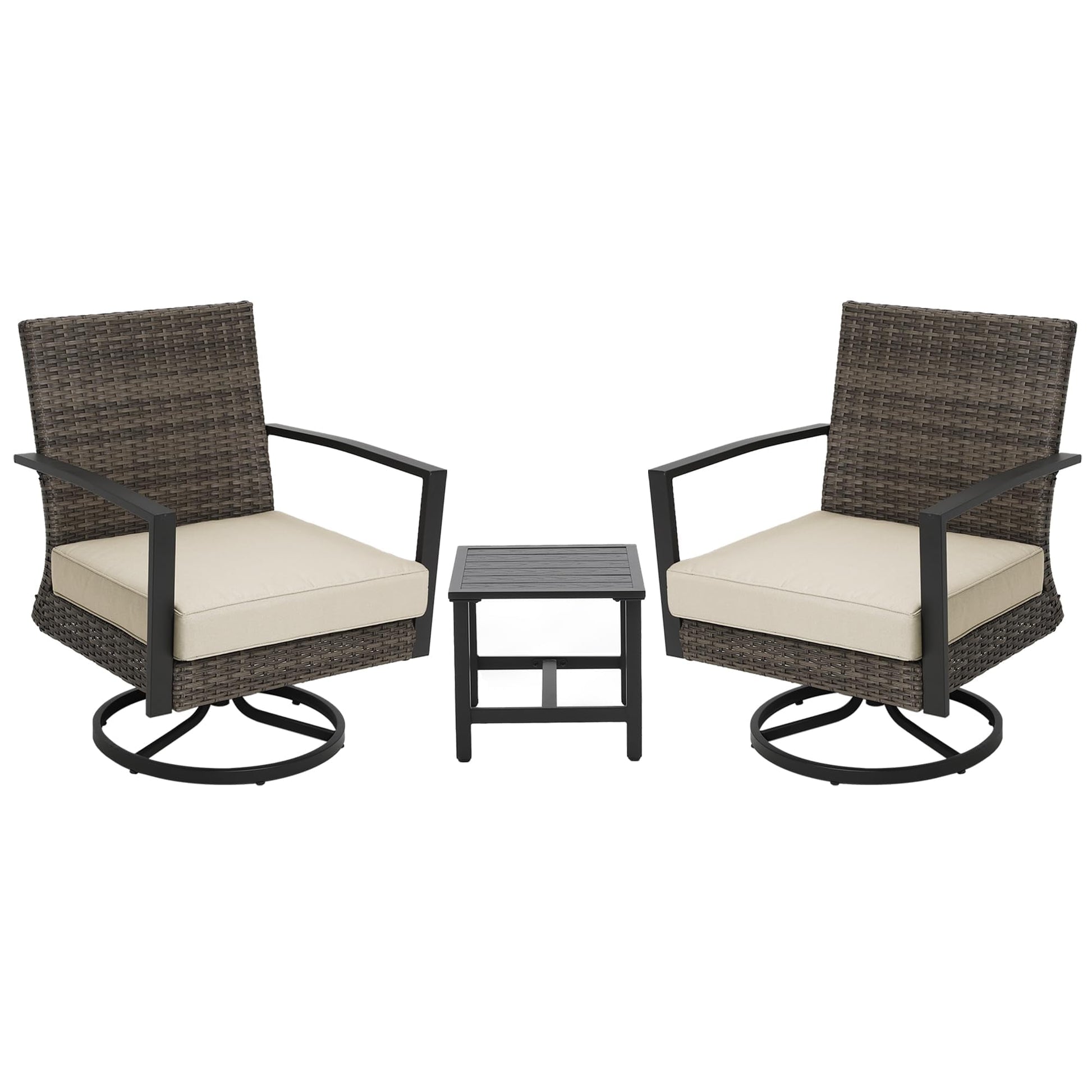 Royalcraft 3 Pieces Patio Bistro Set with Swivel Chair and Small Side Table, Weather Rattan Chairs with Water-Resistant Cushions & Metal Frame, Outdoor Rocking Chairs for Bistro, Pool, Porch, Beige
