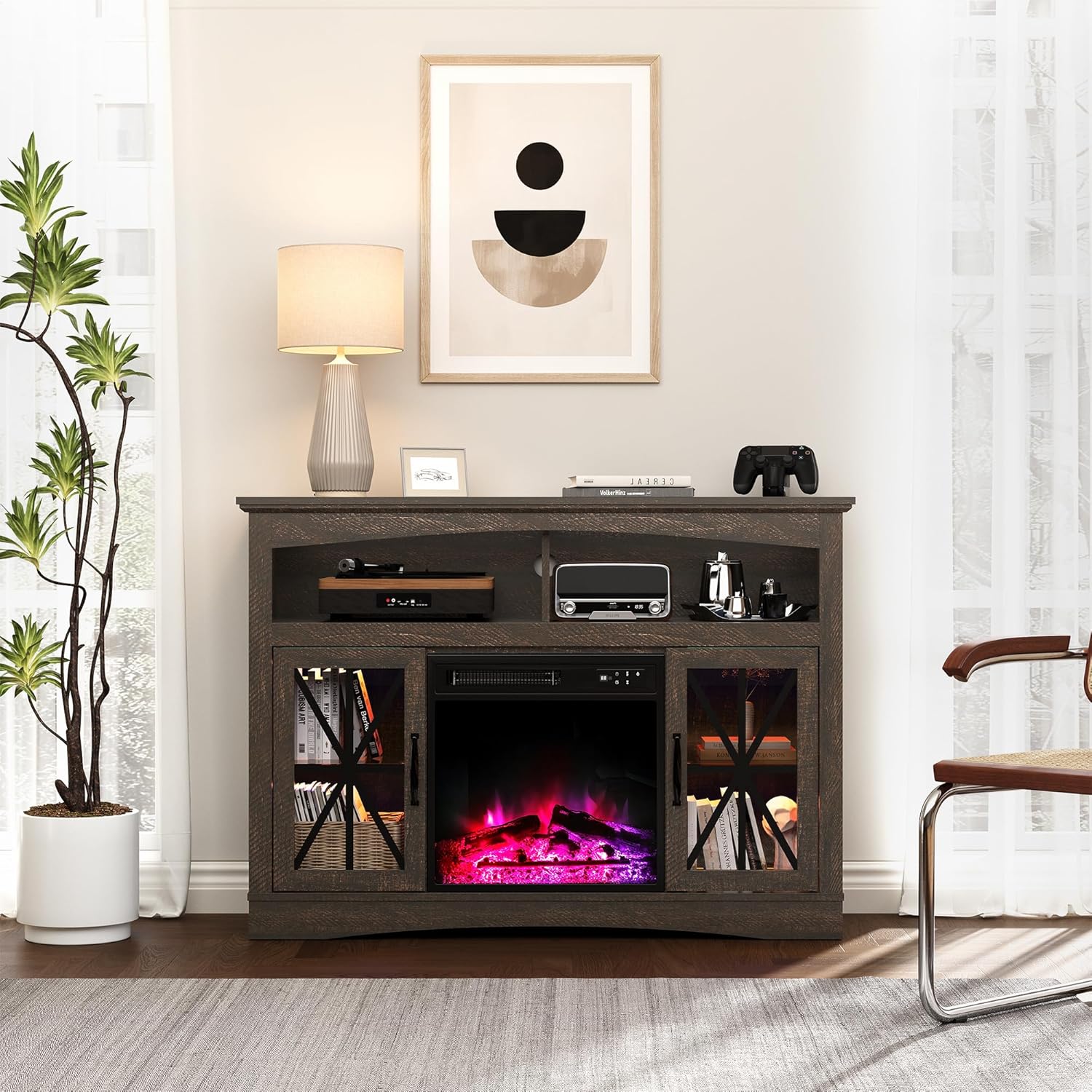 Farmhouse Charm: Bring warmth and elegance to any home with this TV cabinet, featuring a rich brown tone and natural wood grain. Tempered glass doors offer durability while elegantly displaying your collectibles or media devices. Asterisk-like pattern adds a subtle touch of sophistication, and black metal handles introduce a modern accent, perfectly blending style and functionality.Flexible Storage: This TV console provides ample storage space, combining open and closed spaces for both display and practical organization. It features three-level adjustable shelves, with the center shelf easily removable to accommodate an 18'' fireplace insert. Thoughtfully designed storage keeps your living space organized and easy to use.Sturdy Construction: Crafted from P2-grade MDF, this entertainment center ensures long-lasting durability and stability, resisting warping over time. Shatter-resistant tempered glass cabinet doors elegantly display your belongings, while a sturdy 3.54''-thick base enhances load capacity. An anti-tip device provides extra safety, keeping your living room storage secure and organized.Ambient Light: With built-in LED light strips, this TV stand brings a modern, stylish look and a warm, inviting glow. Easily controlled with a remote, it offers 21 dynamic modes and 7 colors, with adjustable brightness and speed. Perfect for movie nights, family gatherings, or everyday decor, it adds both cozy ambiance and unique style to your living room.Versatile Use: Versatile and functional, this accent cabinet adapts to any room. Use it in the living room for your TV and media devices, in a game room to neatly store consoles and accessories, in the bedroom for daily essentials or clothing, or even in the kitchen for organized dishware¡ªcombining practicality with style.Easy assembly and reliable support: This storage cabinet comes with clear, easy-to-follow instructions, allowing even first-time users to assemble it quickly and effortlessly, saving time and energy. Backed by dependable after-sales service, any issues during use can be resolved promptly and professionally, giving you a confident purchase experience.Share
