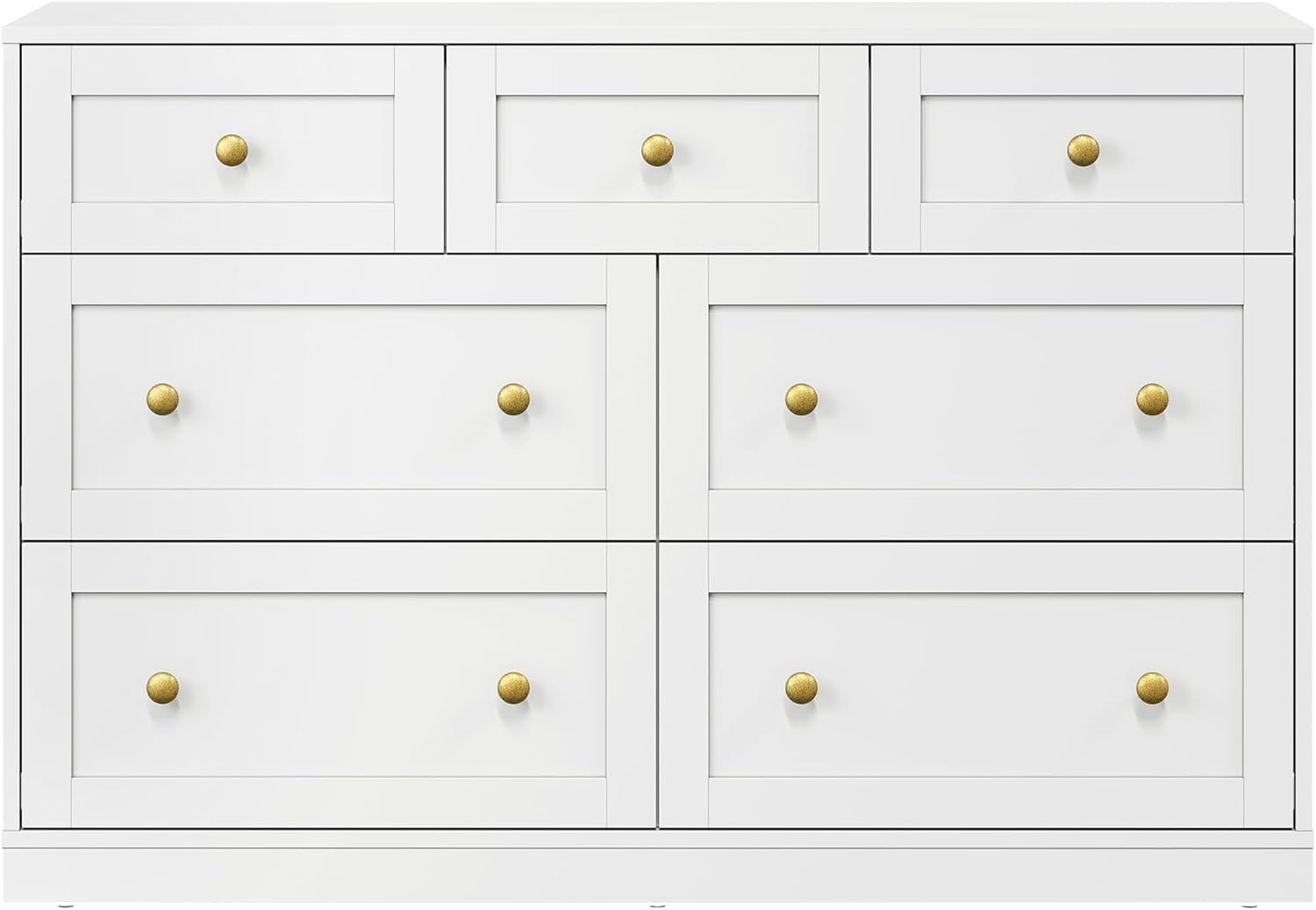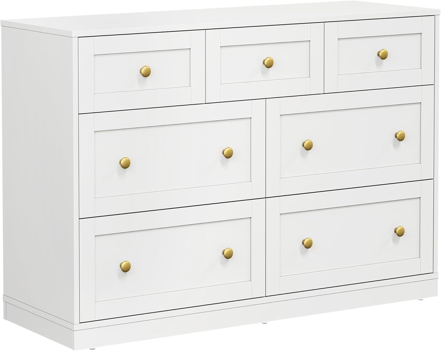 Storage Master: This 7-drawer dresser provides generous, deep storage to neatly organize clothing, bedding, accessories, and more. The wide tabletop offers extra space for d¨¦cor or daily essentials¡ªblending style and function for a clutter-free home.Built To Last: Made from P2-grade wood for strength and durability, this chest of drawers features a sleek, smooth surface that's easy to clean. Non-slip foot pads keep it securely in place, and the included anti-tip device prevents accidents¡ªperfect for homes with children, elderly family members, or pets, combining safety, practicality, and comfort.Timeless Elegance: This storage organizer in pristine white blends effortlessly with any decor, offering a clean and bright look. Framed drawer fronts with elegant gold handles add a touch of sophistication. Ideal for the living room, bedroom, hallway, or entryway, it combines practical storage with timeless style.Versatile Use: With its unique style, this drawer cabinet blends seamlessly into any space. Use it as a vanity in the bedroom, a storage unit for baby essentials, an entryway console, a TV stand or display piece in the living room, or even a buffet cabinet in the kitchen. Its versatile design meets both storage and decorative needs across multiple rooms.Easy Setup: Easy to maintain¡ªjust wipe the surface with a damp cloth to keep it looking like new. Assembly is hassle-free with the included step-by-step manual¡ªno special skills needed, and you can do it solo. Have questions? Our support team is ready to help and will respond within 24 hours.Share