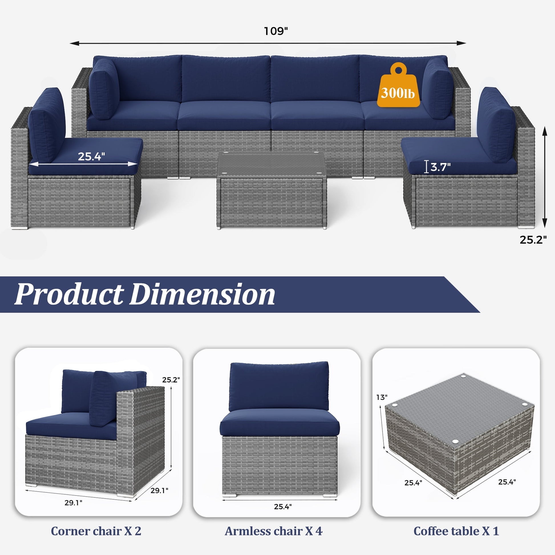 Royalcraft 7 Pieces Outdoor Conversation Set, All-Weather Wicker Rattan Sectional Sofa Set with Cushions & Coffee Table, Blue