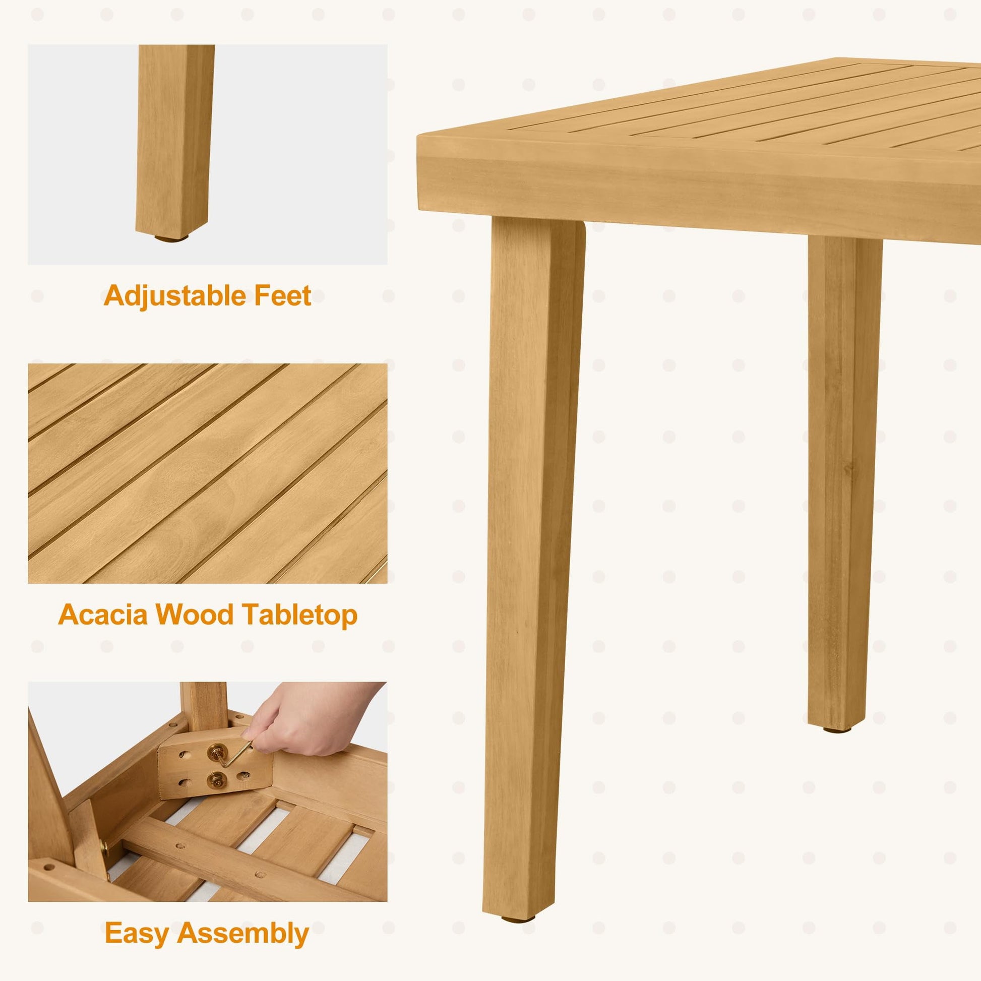 • Exceptional Quality: Made from robust acacia wood, this outdoor dining set is built to last. The sturdy iron table legs provide exceptional stability, while the powder-coated finish protects against rust, fading, and cracking.