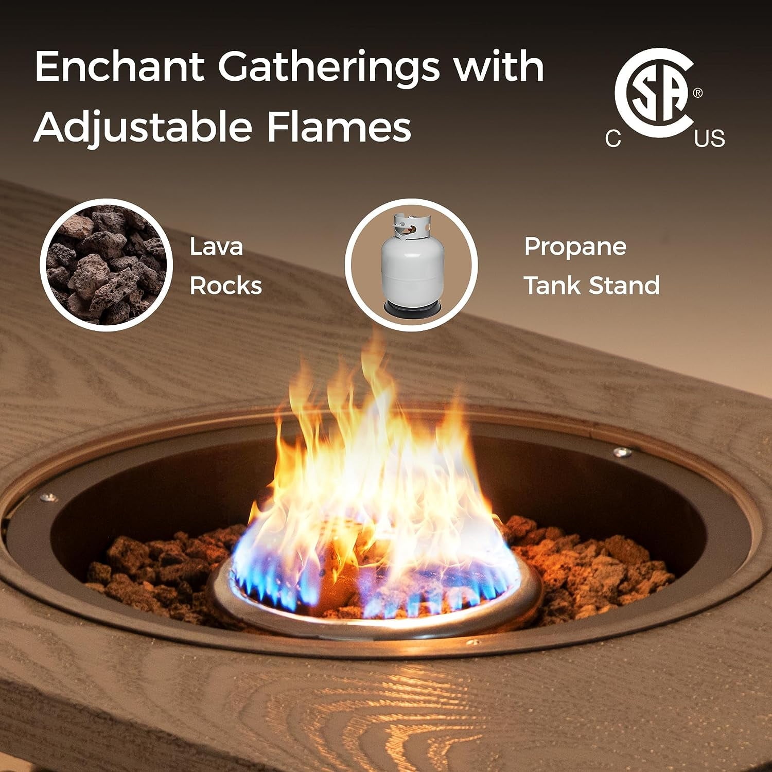 - 【50,000 BTU Stainless Steel Burner】Our CSA-certified gas fire pit table provides a clean and smokeless burn. The piezo ignition ensures easy control, and the included volcanic rocks help retain warmth longer while adding a classic rustic atmosphere.