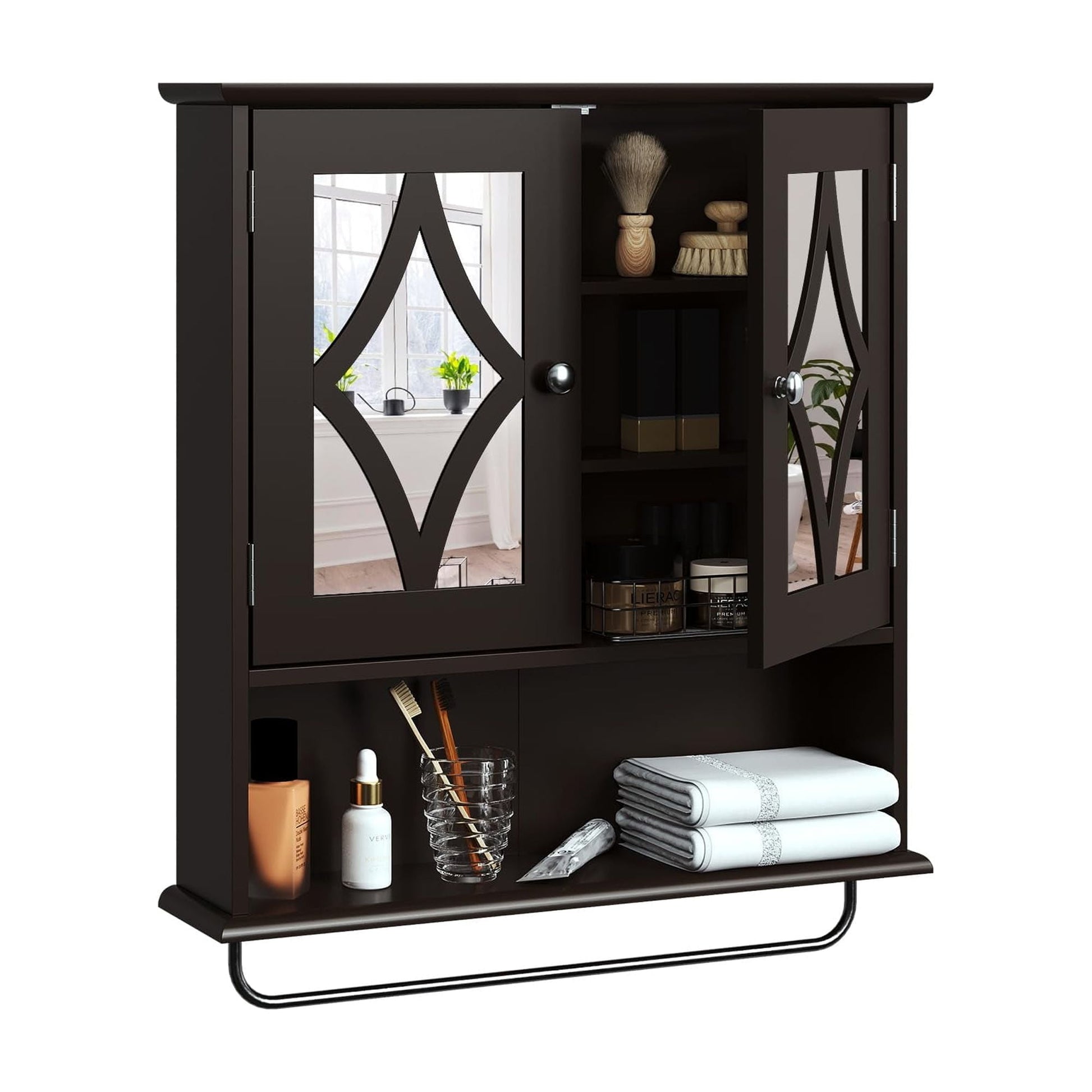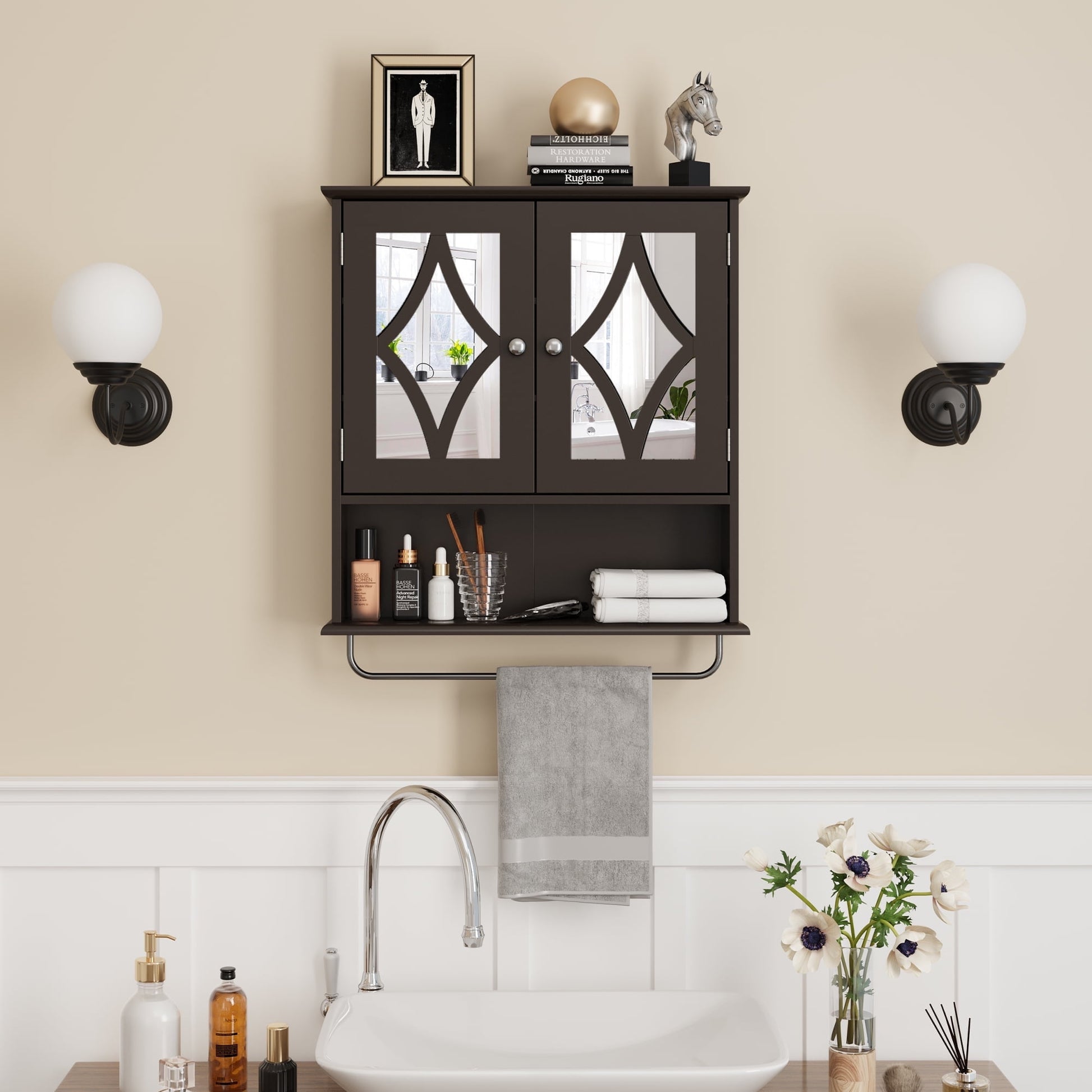 RoyalCraft Bathroom Medicine Cabinet with Mirror, Vanity Wall Mounted Storage Cabinet with Adjustable Shelves and Towel Bar, Hanging Wall Cabinet for Bathroom, Laundry, Living Room, Brown