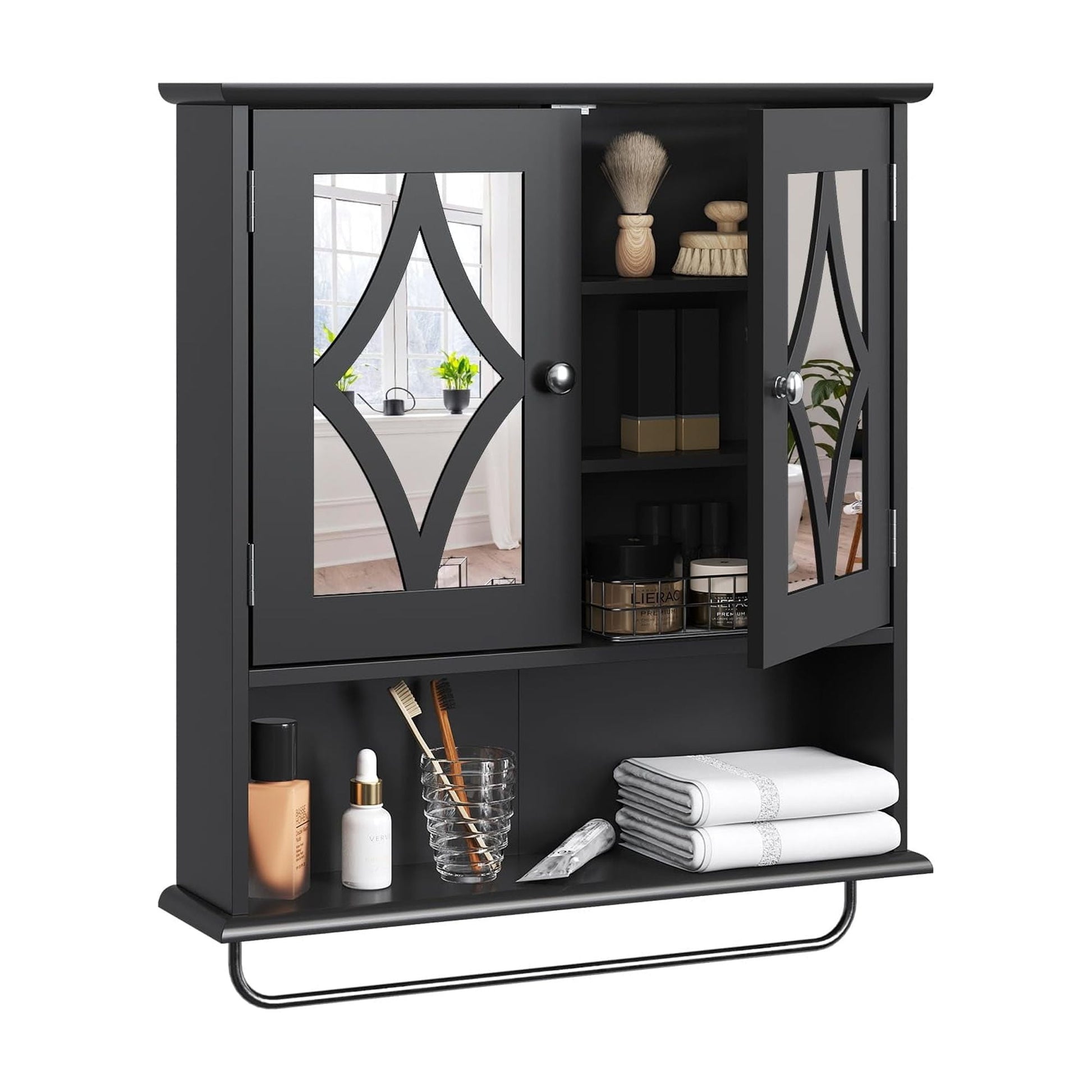 Upgrade your space with the RoyalCraft Bathroom Medicine Cabinet with Mirror, a stylish and functional bathroom cabinet wall mount solution. This black medicine cabinet features a sleek, retro-inspired design with diamond pattern accents, making it a standout addition to any bathroom, laundry, or living room. The bathroom mirror cabinet black finish complements modern and vintage decor alike, while the wall-mounted design saves valuable floor space. Equipped with two adjustable shelves and an open towel rack, this bathroom medicine cabinet with mirror offers ample storage for daily essentials, keeping your bathroom organized and clutter-free. Crafted from durable MDF with a water-resistant coating, the cabinet bathroom wall mount is built to withstand humidity and moisture, ensuring long-lasting use. The dual doors with mirrors provide convenient access and enhance the sense of space, making it ideal for small bathrooms. Whether you need a bathroom wall cabinet black for extra storage or a bathroom mirror with storage black for added convenience, this medicine cabinet for bathroom black delivers both style and practicality. Easy to assemble with included instructions, the RoyalCraft bathroom mirrored medicine cabinet is the perfect choice for a functional and elegant upgrade.