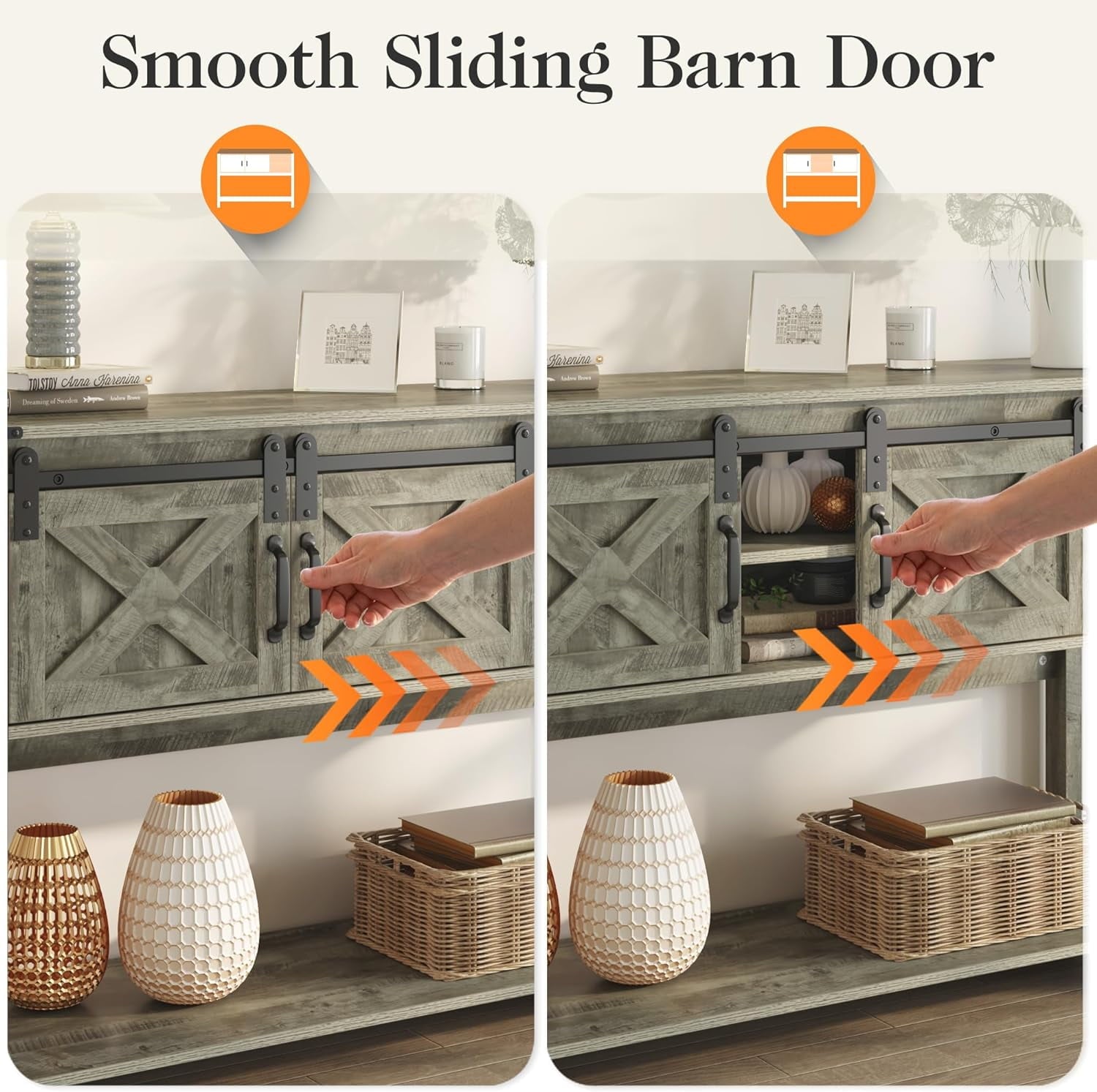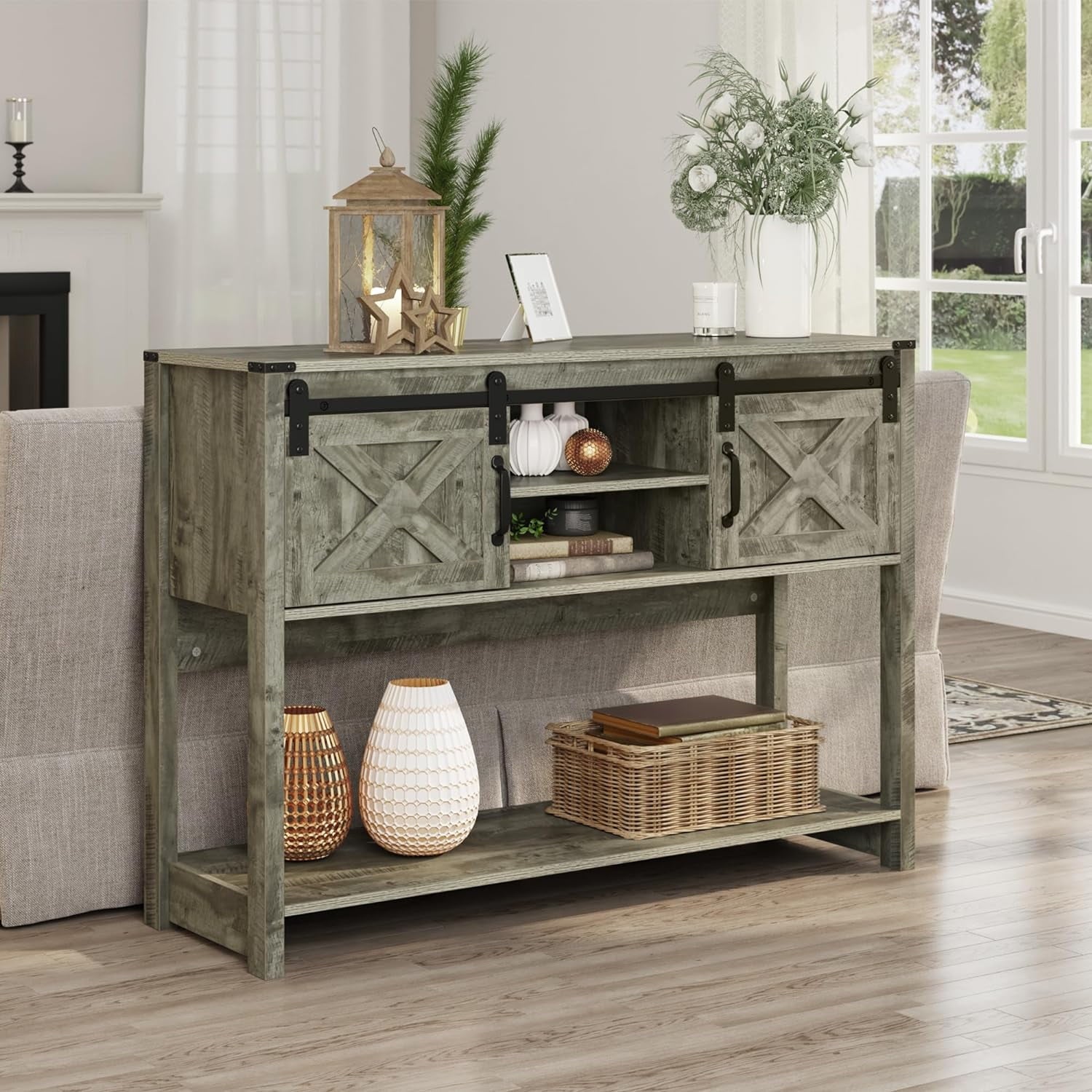 Royalcraft Entryway Table with Storage Cabinets, 46" Modern Farmhouse Console Table with Sliding Barn Door, Wood Rustic Sofa Table with Adjustable Shelf for Hallway, Living Room, Foyer, Light Grey