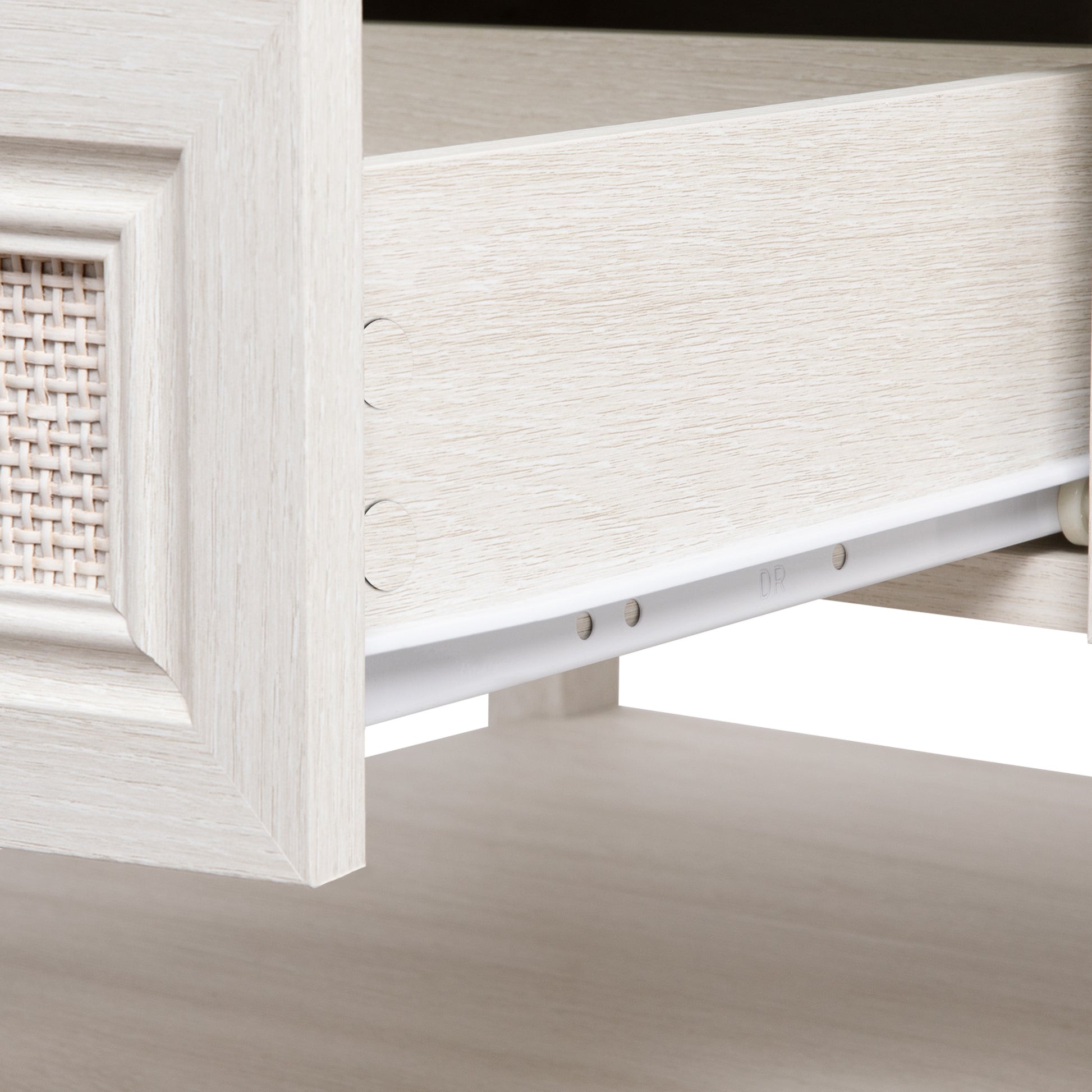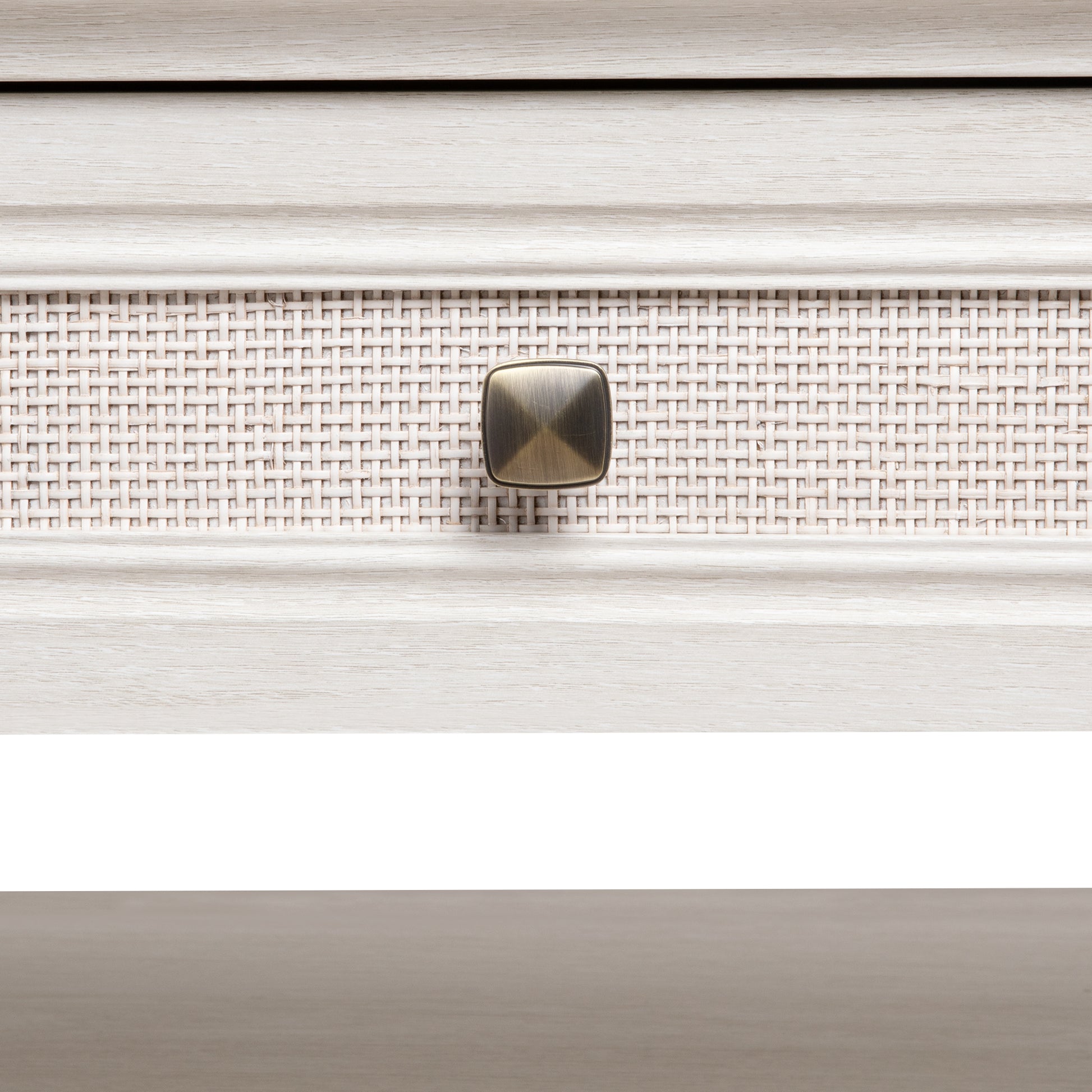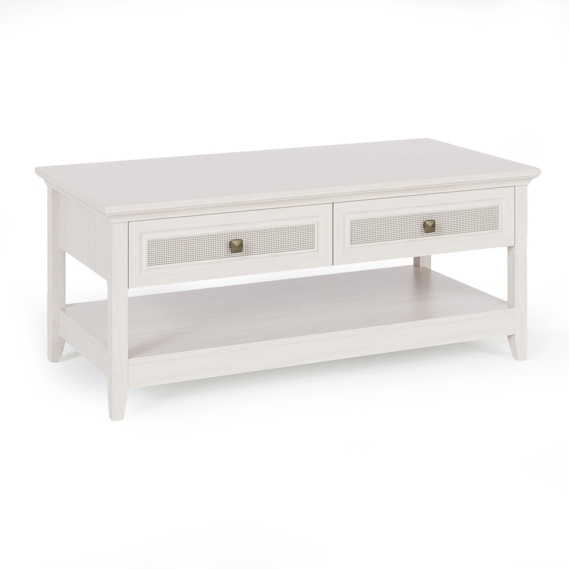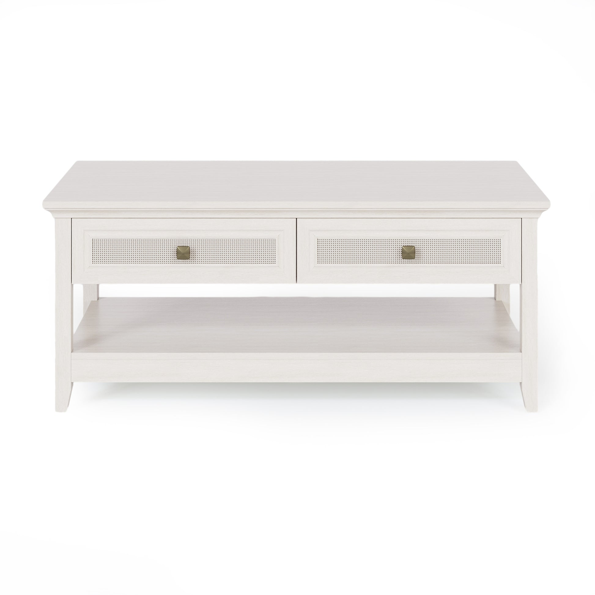 Elegant Charm: Featuring a grayish white wood grain panel with a rattan design, our coffee table seamlessly blends vintage and modern aesthetics, showing a Boho style. With diagonal bronze knobs and wave arc table corners, it embodies sophistication and eclectic charm.