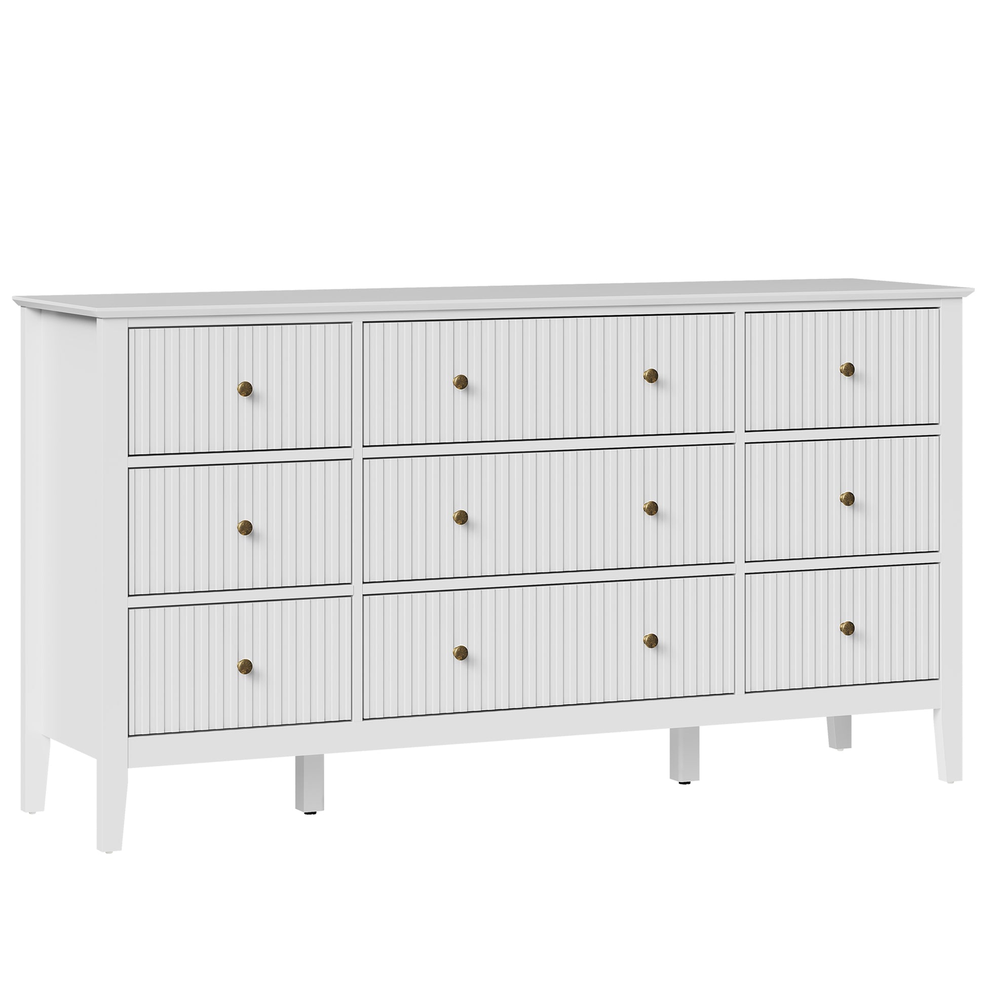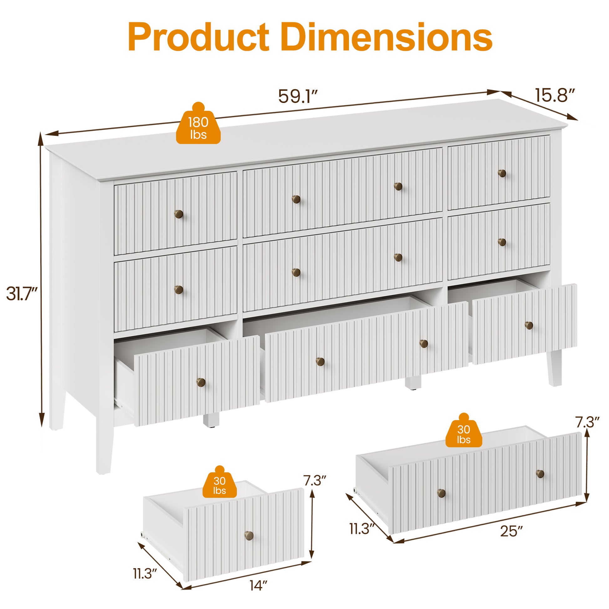 Royalcraft Fluted 9 Drawer Dresser, 59'' Wide Modern Chest of Drawers with Metal Handles, Wooden TV Stand Storage Organizer for Bedroom, Living Room, Entryway, White