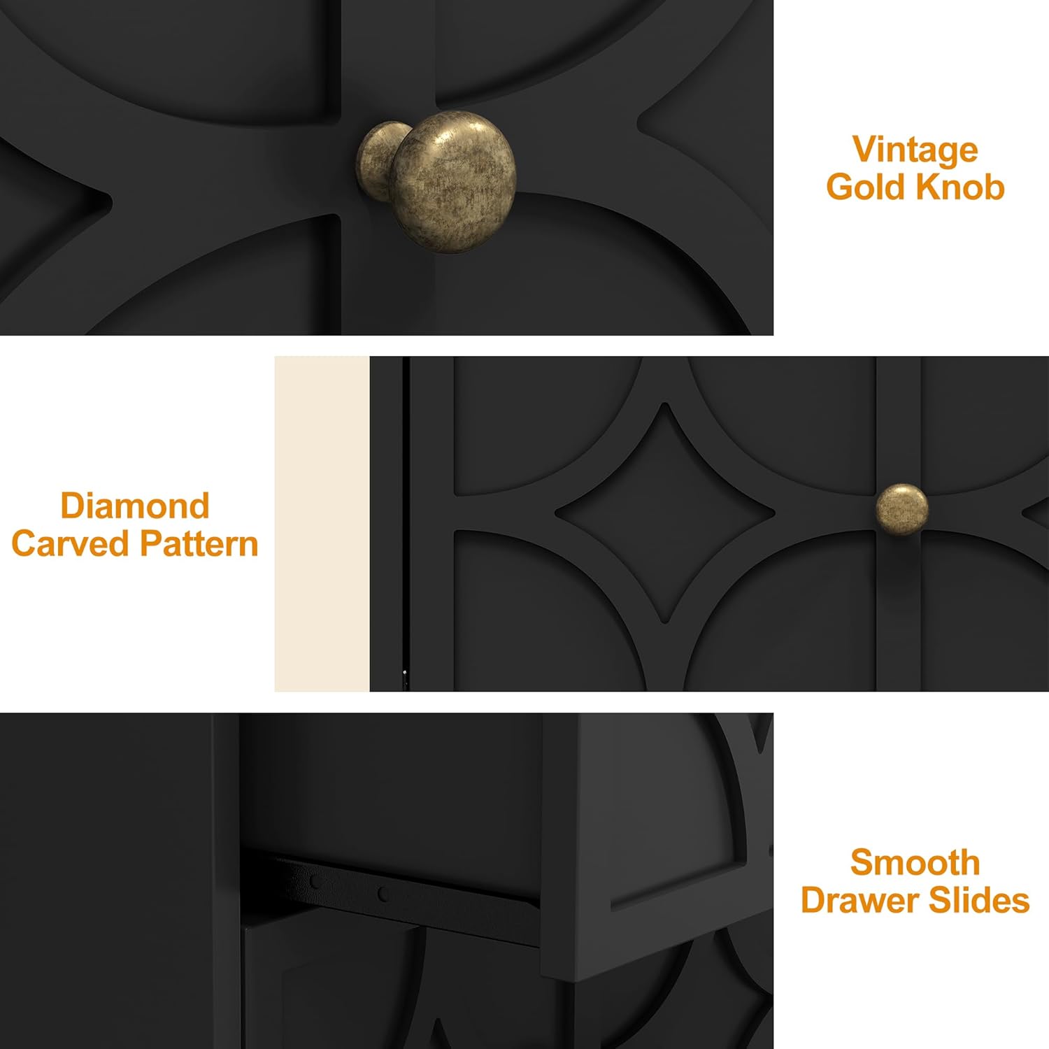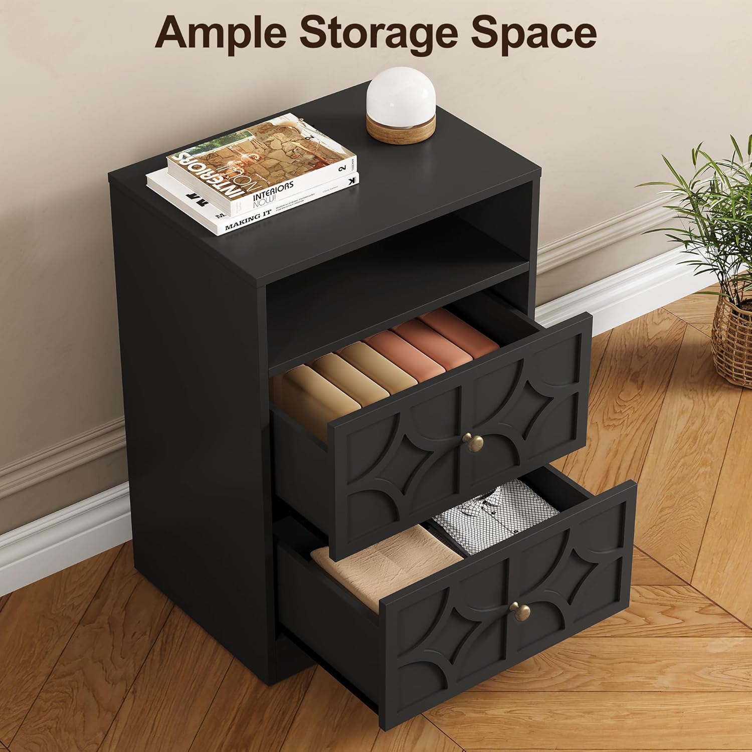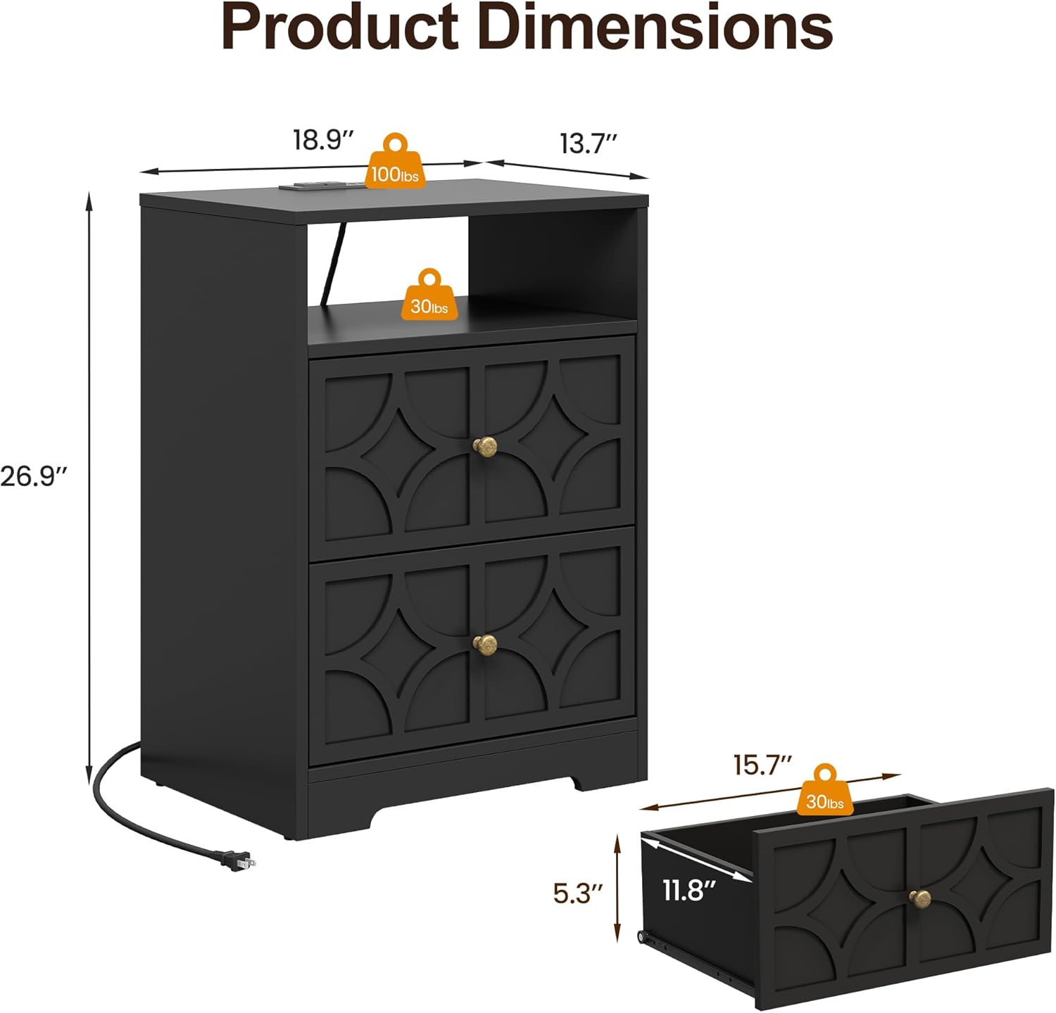 Modern Elegance: Showcasing a deep black finish, this side table features drawer panels with 2-inch-deep diamond carvings for added elegance. Gold metal handles add subtle luxury, while built-in outlets make powering lamps or charging devices effortless¡ªcombining style and everyday convenience.Sturdy and Safe: Crafted from premium MDF for lasting strength and everyday durability, this large nightstand is coated with safe, odor-free paint and is perfect for homes with children, seniors, or active pets. Its anti-tip design prevents accidental tipping, reducing safety risks and giving you peace of mind.Storage Master: Combine style and practicality with this end table, featuring two large drawers for clothes, bedding, documents, or daily essentials. The open shelf keeps books, magazines, and remotes within easy reach, while the spacious tabletop holds a lamp, photos, or plants¡ªkeeping your living room or bedroom organized and inviting.Wide Usage: Versatile in design, this bedside table adapts to any space in your home. Use it as a bedside table in the bedroom to hold a lamp, alarm clock, or books; as a side cabinet in the living room for remotes, magazines, or d¨¦cor; as a small storage cabinet in the office for files and supplies; or in the entryway to keep keys, mail, and everyday items organized.Easy Assembly and Cleaning: This night stand features a smooth, water-resistant painted surface¡ªsimply wipe away dust with a damp cloth to keep it looking like new. It comes with a detailed instruction manual, making assembly simple. Our support team is available 24/7 to answer any questions, ensuring a hassle-free experience.Share