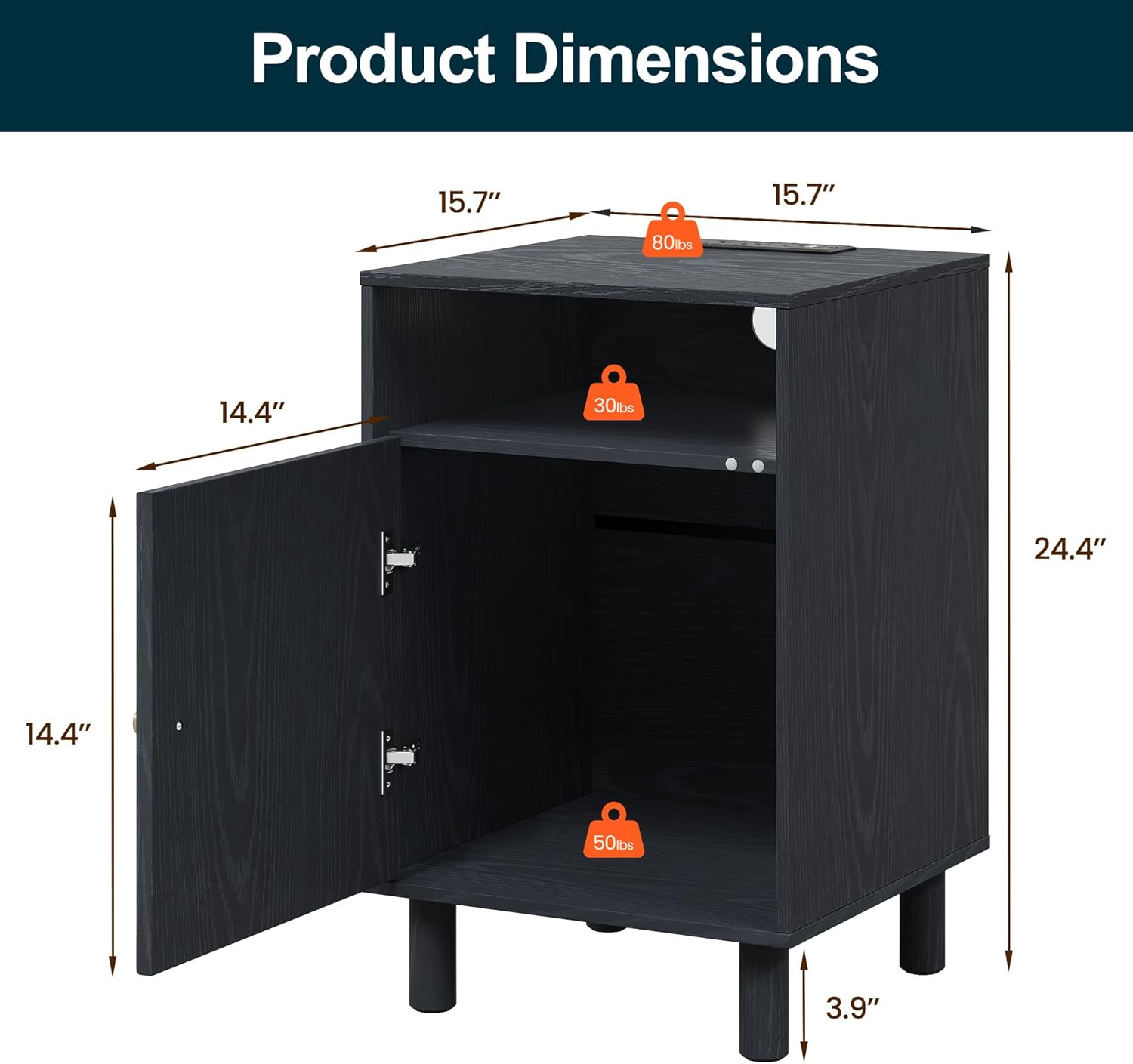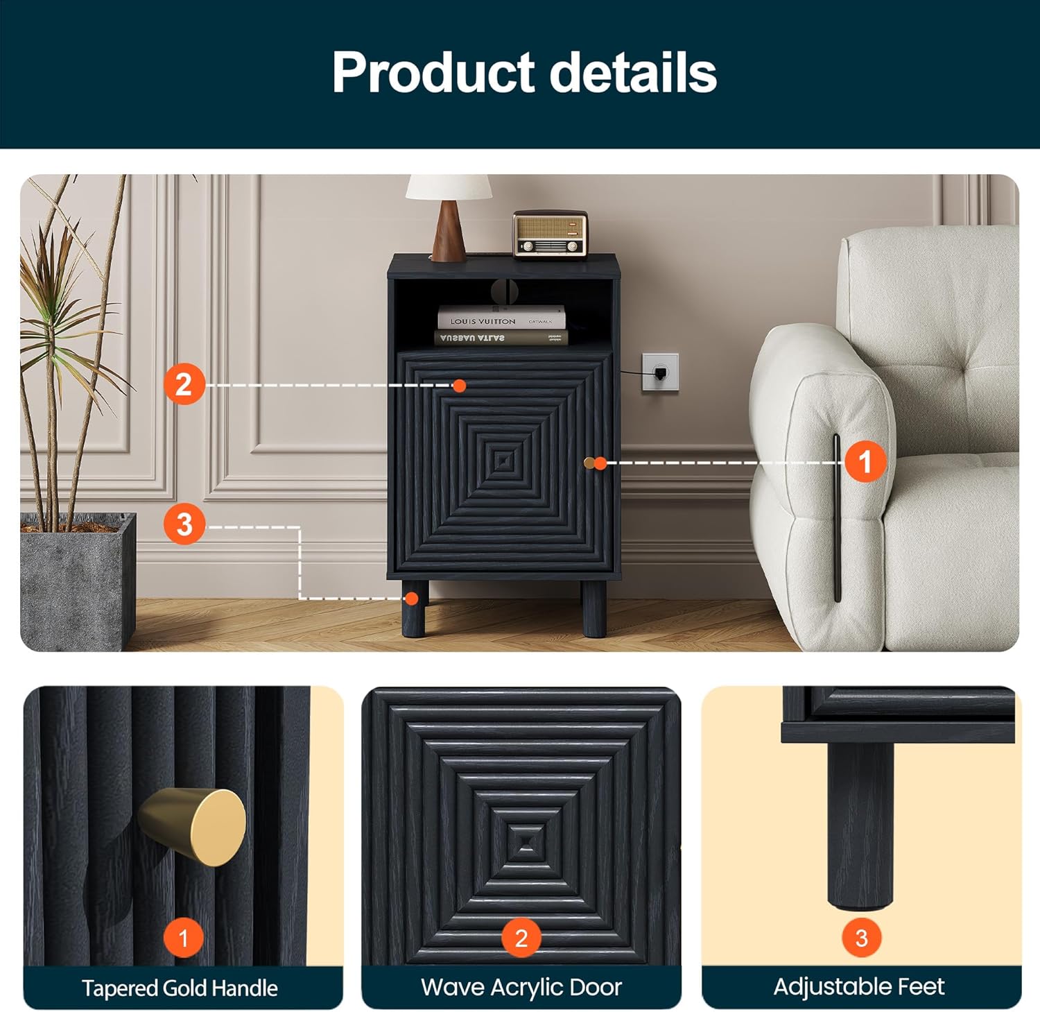Sleek & Stylish: This nightstand comes in a black finish with elegant wood grain, exuding a refined modern charm. Its door showcases a bold concentric square pattern for added depth and style, while a gold knob lends a hint of luxury. Supported by sturdy cylindrical legs, it combines function with sophistication, making it a stylish addition to any room.Ample Storage Space: Combining closed and open storage, this nightstand offers smart organization for your everyday essentials. A spacious tabletop accommodates lamps, photo frames, or d¨¦cor, while the built-in outlet keeps your devices charged at hand. The back cable hole neatly manages wires, creating a tidy and stylish look.Sturdy and Safe: Crafted from P2-grade wood, this bedside table is sturdy and reliable for long-term use. Solid wood legs provide strong support, while anti-slip pads enhance stability and protect the floor from scratches. For added safety, it comes with an anti-tip design to prevent accidental tipping, making it a reliable choice for everyday use.Wide Usage: Versatile in design, this end table adapts to any space in your home. Use it as a bedside table in the bedroom to hold a lamp, alarm clock, or books; as a side cabinet in the living room for remotes, magazines, or d¨¦cor; as a small storage cabinet in the office for files and supplies; or in the entryway to keep keys, mail, and everyday items organized.Easy Assembly and Cleaning: This night stand features a smooth, water-resistant surface¡ªsimply wipe away dust with a damp cloth to keep it looking like new. It comes with a detailed instruction manual, making assembly simple. Our support team is available 24/7 to answer any questions, ensuring a hassle-free experience.Share