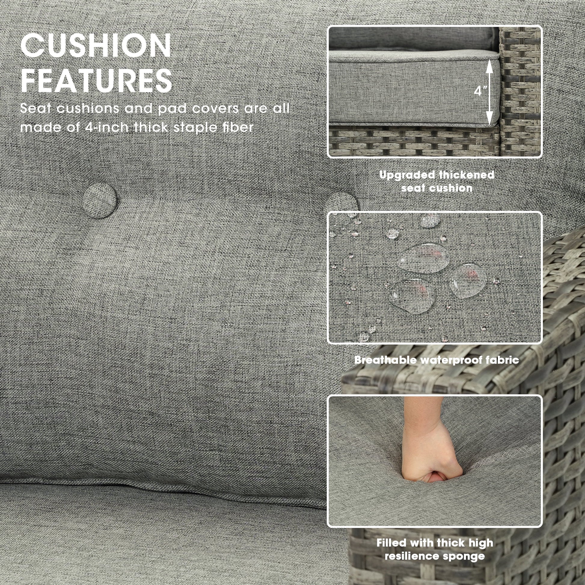 Would you like to enjoy a cup of coffee or take a break with your friends in an outdoor space? Our outdoor wicker furniture is perfect for you. The exquisite willow design is hand-woven with polyethylene resin thread, while the sturdy powder-coated frame ensures year-round use of the furniture. It is ideal for placing on your patio, porch, poolside, or sunroom. With a deep-seating design and supportive cushioning, it allows you to comfortably rest and relax for hours. The cushions are made of soft, all-weather olefin, which is waterproof and weather-resistant, and can maintain a long-lasting fashionable style. The fresh grey/beige/dark grey cushions not only add a vibrant look to your space, but also provide you with more comfort. This set provides four color options to meet your patio needs. Additionally, we also offer the option to purchase individual pieces, allowing you to easily expand your combination set.