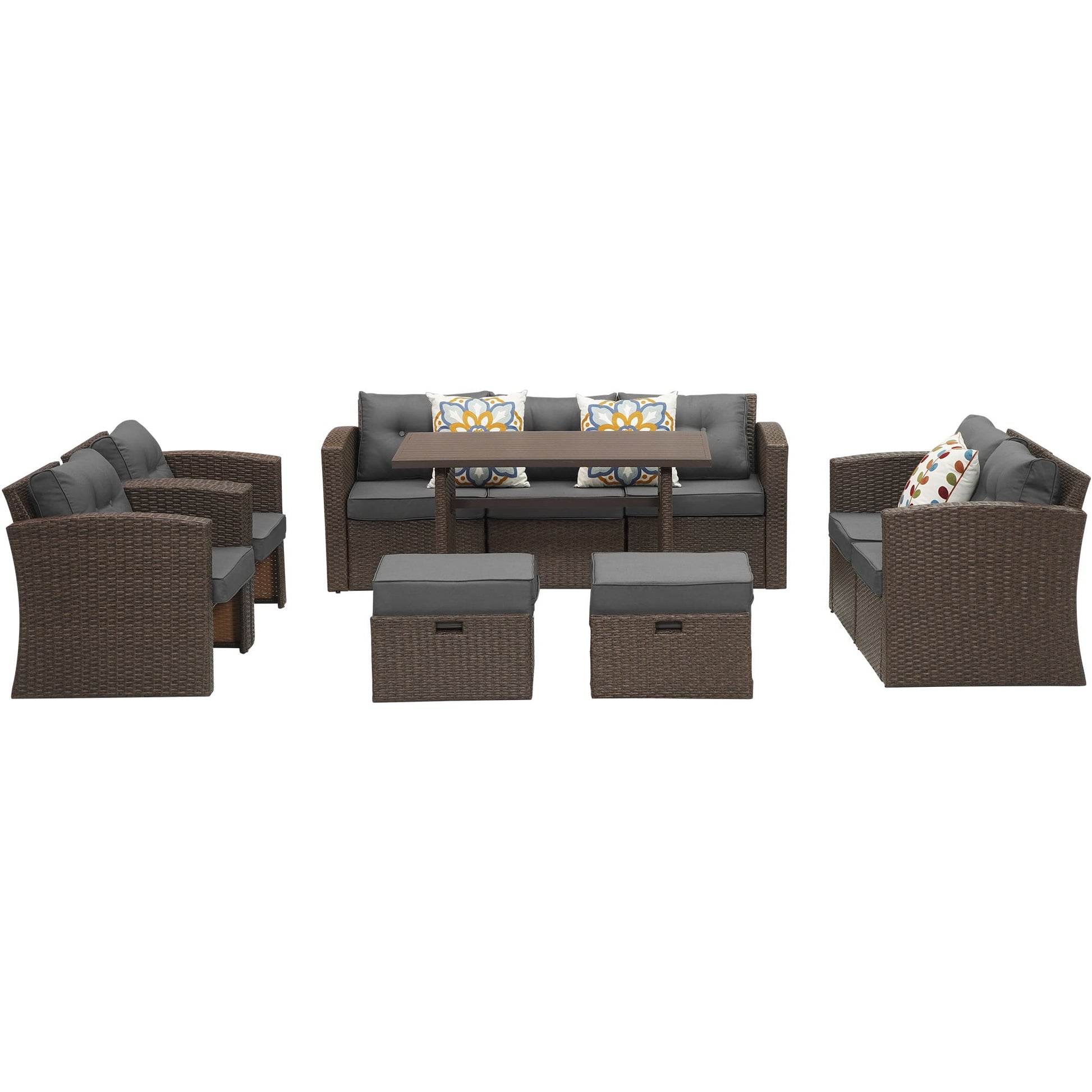 Royalcraft Outdoor Patio Furniture Set,10 Pieces Outdoor Sectional Wicker Sofa PE Rattan Conversation Sets with Dining Table,Aluminum Frame,Brown
