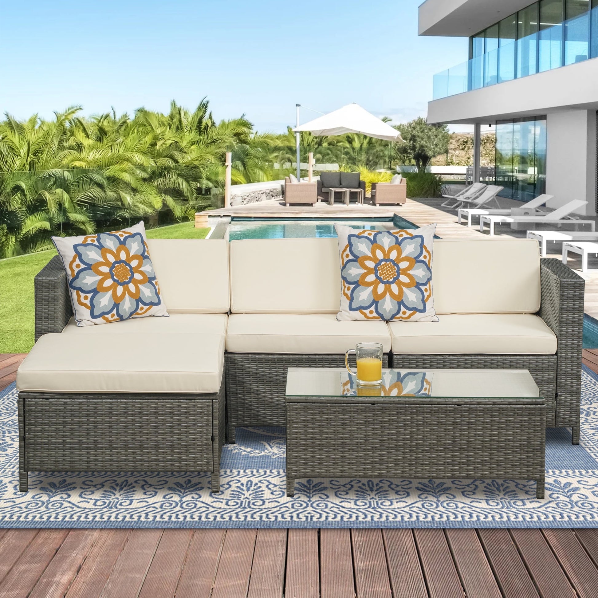 Royalcraft Outdoor Patio Set,5 Pcs PE Wicker Rattan Outdoor Furniture Set, Tempered Glass Coffee Table, White