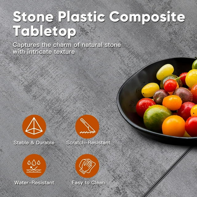 Stone Plastic Composite Tabletop: Our patio table features a durable, water-resistant, and scratch-resistant top, making it sturdy and easy to clean. Capturing the allure of natural stone texture, it adds aesthetic charm to your outdoor dining space.