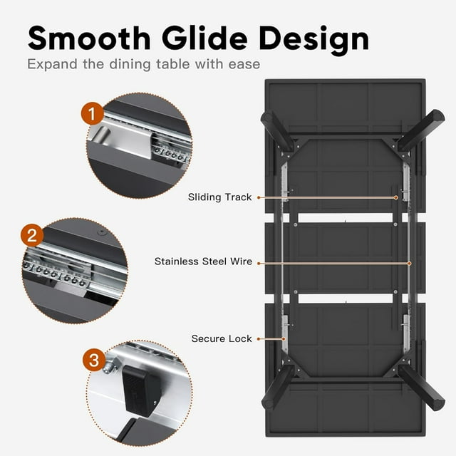 Easy To Expand: Pull the tabletop apart to the sides, and the hidden section will automatically rise, seamlessly transforming from a 4-6 person setting to a spacious 6-8 person arrangement. Featuring a smooth sliding track and secure locking mechanism for added convenience.