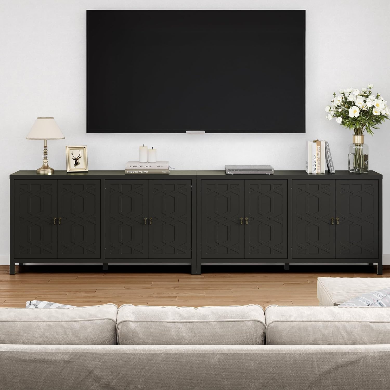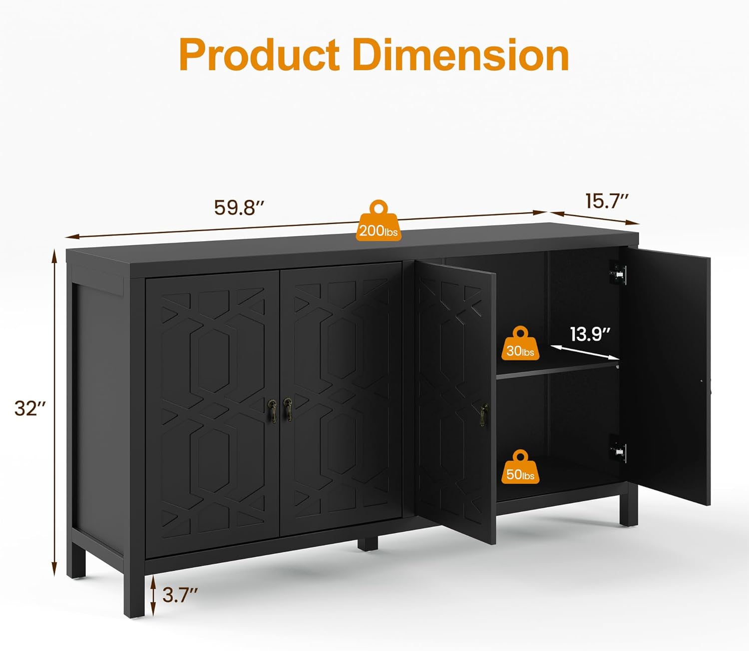 Transform your space with this stylish storage cabinet, featuring 3-level adjustable shelves for personalized organization. Its sleek black finish and vintage bronze handles add character, while the soft-close doors ensure quiet use. This buffet cabinet can serve as a chic TV stand, a practical pantry, or an elegant entryway table. With a waterproof, easy-to-clean surface, it¡¯s perfect for DIY enthusiasts looking to customize its look¡ªwhether you want to add stencils, paint, or unique hardware, the options are endless. Create a cozy environment while showcasing your personal style with this beautiful accent piece!