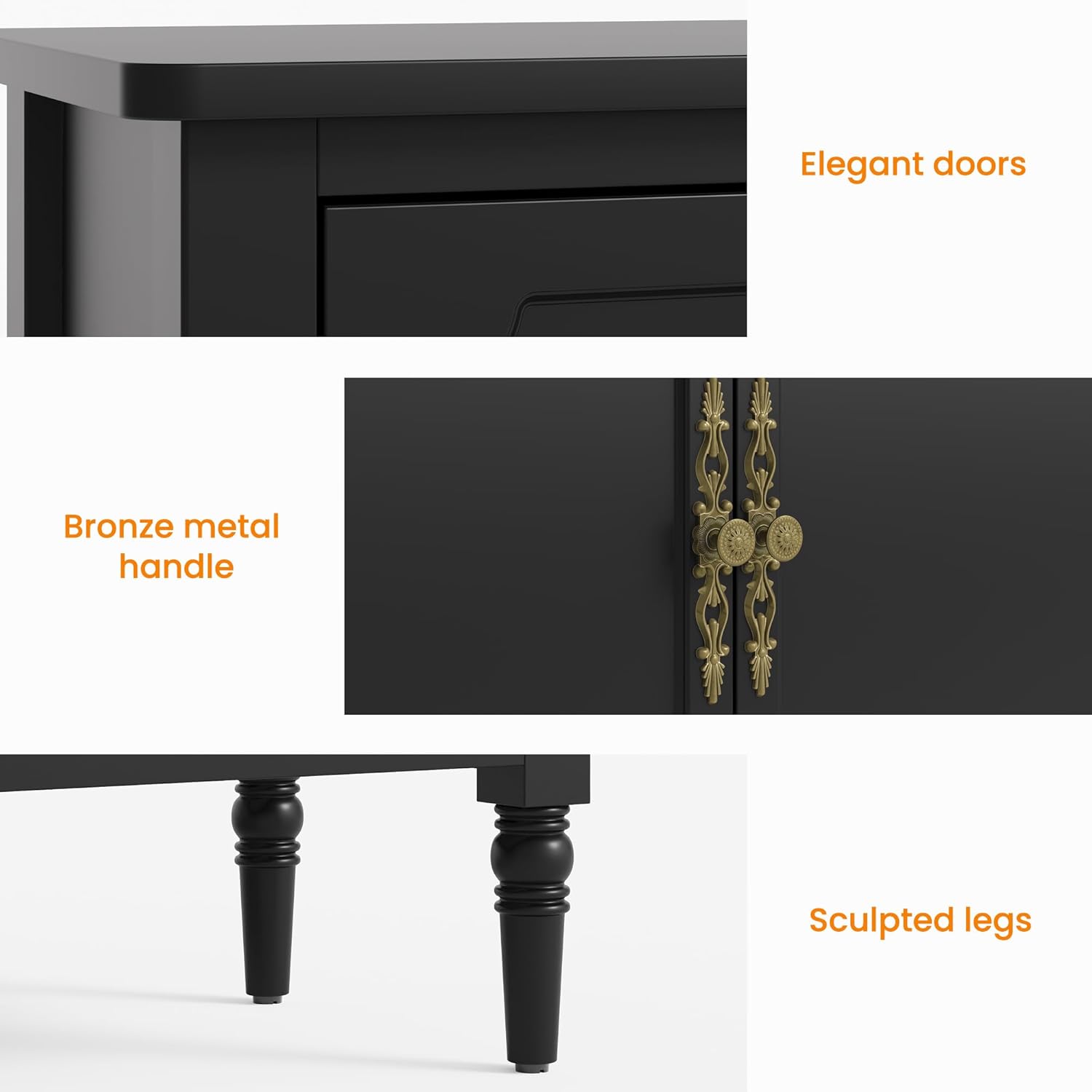 Flexible Storage: The storage cabinet boasts a spacious tabletop and ample internal storage, with five adjustable shelves for personalized organization. Without shelves, it easily accommodates larger and taller items, allowing you to adapt and arrange it to suit your space and needs for maximum flexibility.Stylish Charm & Slient Design: With a black painted finish, bronze metal door handles, and turned legs, this sideboard cabinet radiates vintage charm. The soft-close door design minimizes noise during use, making it perfect for quiet spaces and reducing impact damage. Combining practicality and style, it seamlessly enhances any home decor.Safe Material: The cabinet is crafted from high-quality MDF and solid wood legs for durability and stability. Its safe paint meets TSCA, EPA, and ASTM standards, ensuring your peace of mind. Additionally, the waterproof, easy-to-clean surface allows for DIY customization, making it a beautiful addition to your home decor.Versatile Use: This accent cabinet boasts a unique style that fits seamlessly into any space, helping you stay organized and clutter-free. Use it as a TV stand, pantry cabinet, entryway table, wardrobe, or office storage. It's the ideal addition to enhance your home decor!Easy Assembly: Includes clear installation instructions and all necessary accessories, including anti-tip hardware for added stability. Assembling this buffet cabinet is a breeze. Enjoy professional customer service before and after your purchase¡ªreach out anytime, and we¡¯ll resolve any issues within 24 hours.Share