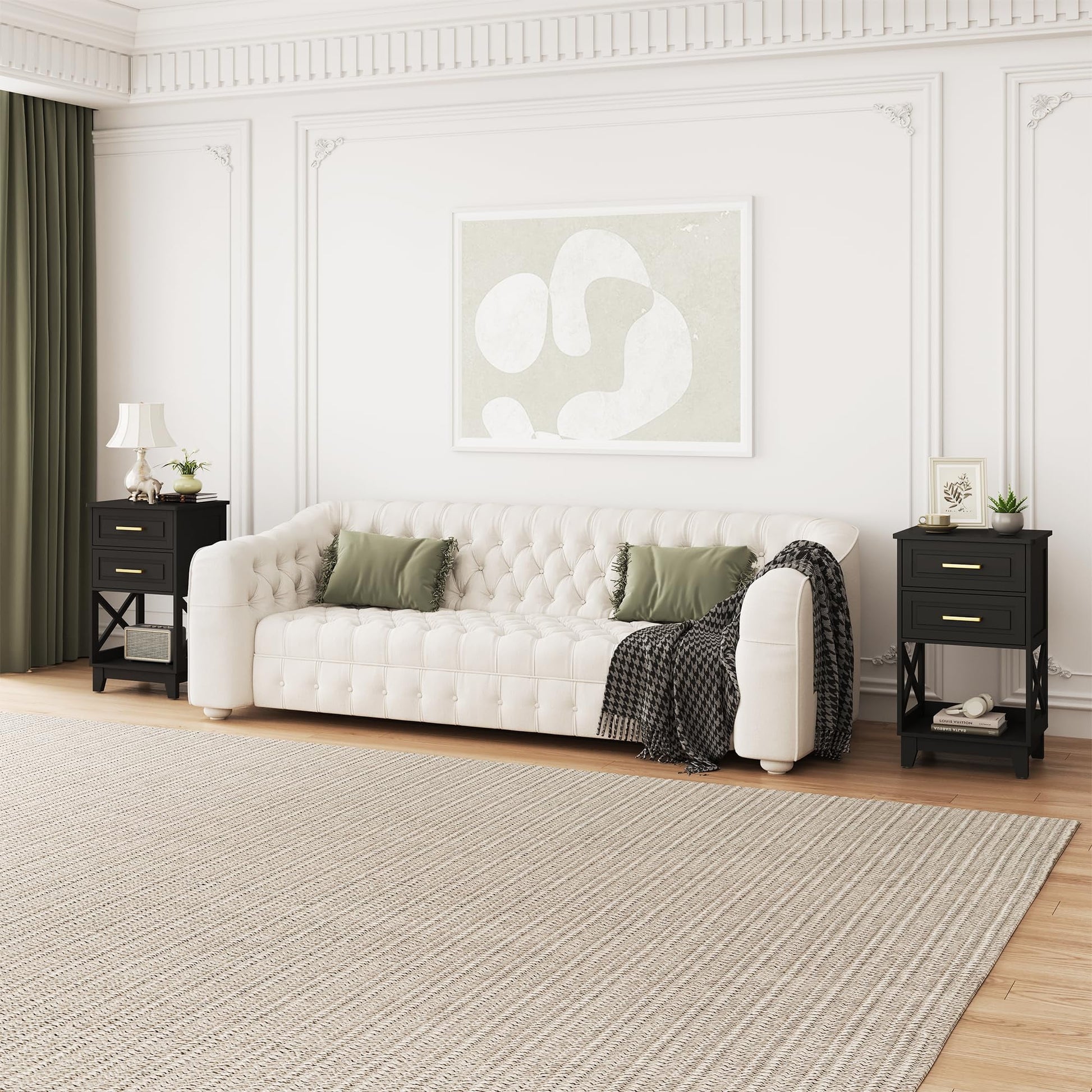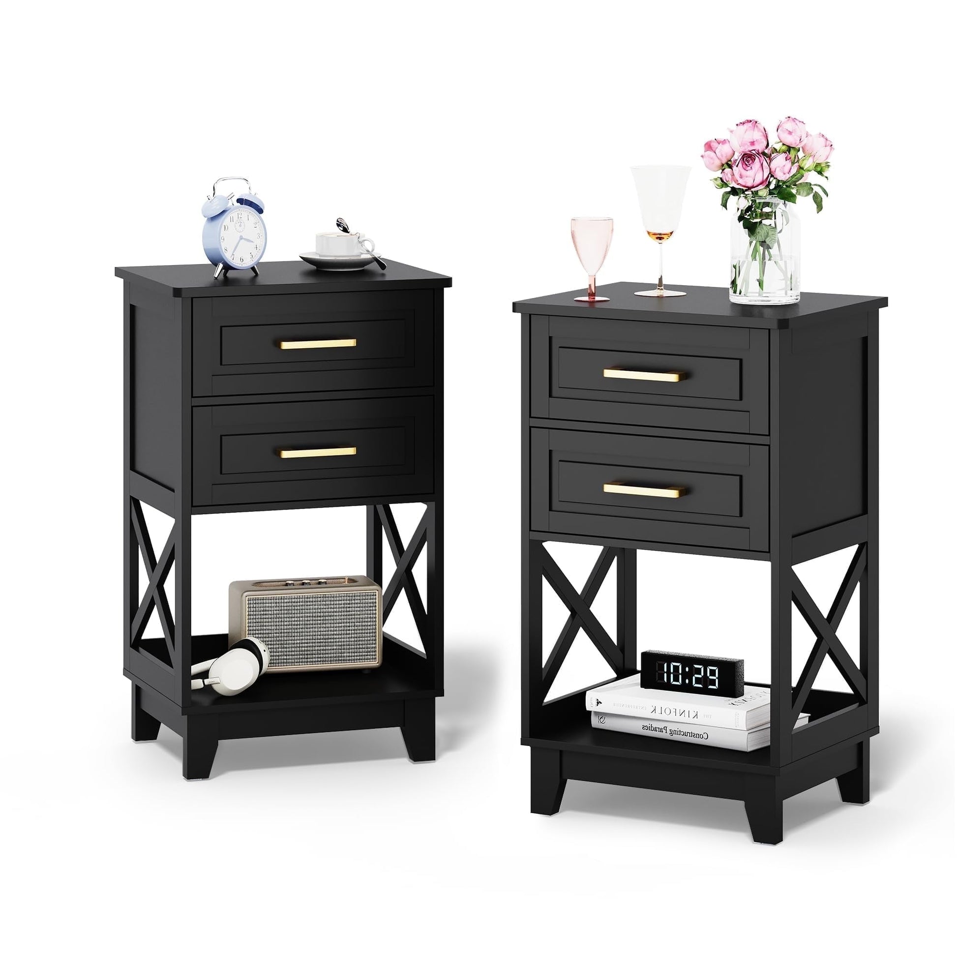 Our modern nightstand is an essential addition to elevate your home decor! This end table offers generous storage with two drawers and an open shelf, ensuring organized spaces and a tidy environment. Crafted from solid MDF material with a unique X-frame design, the side table guarantees stability and longevity to effortlessly meet your daily demands. The water-resistant painted surface ensures easy maintenance¡ªsimply wipe clean with a cloth. Its sleek and versatile design adapts perfectly as a bedside table or storage end table, ideal for bedrooms, living rooms, entryways.