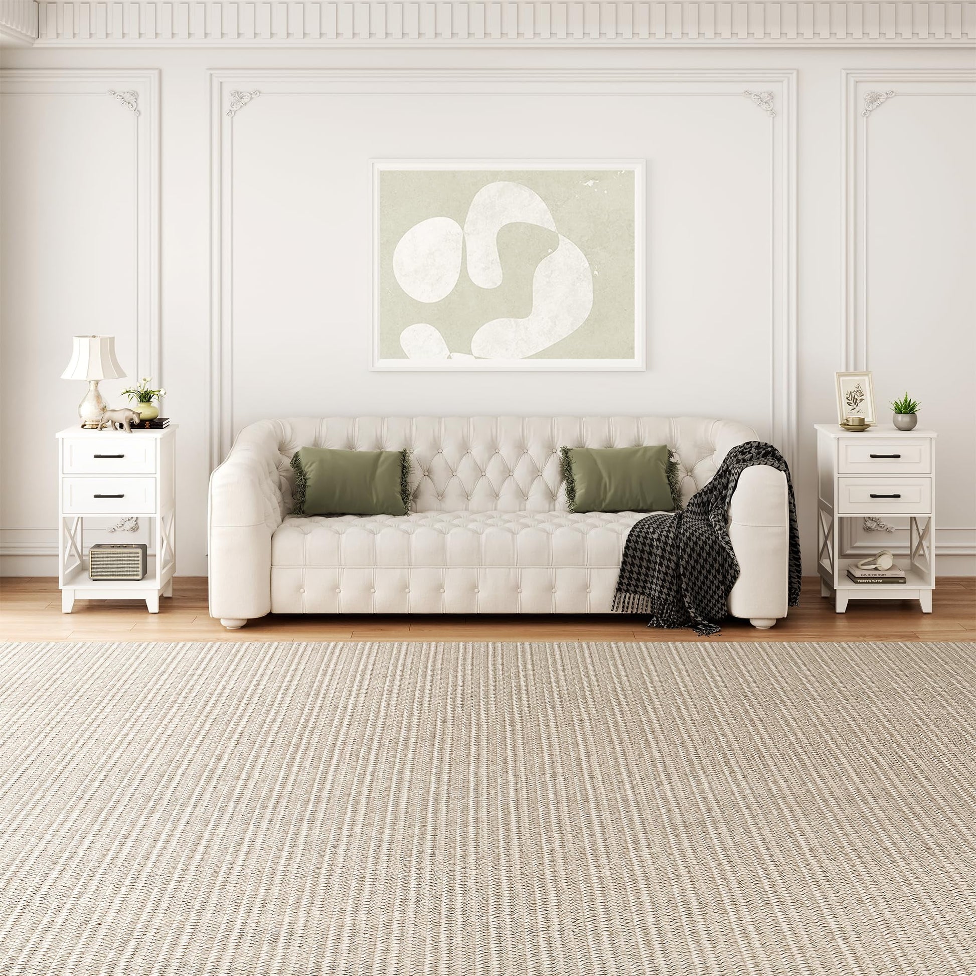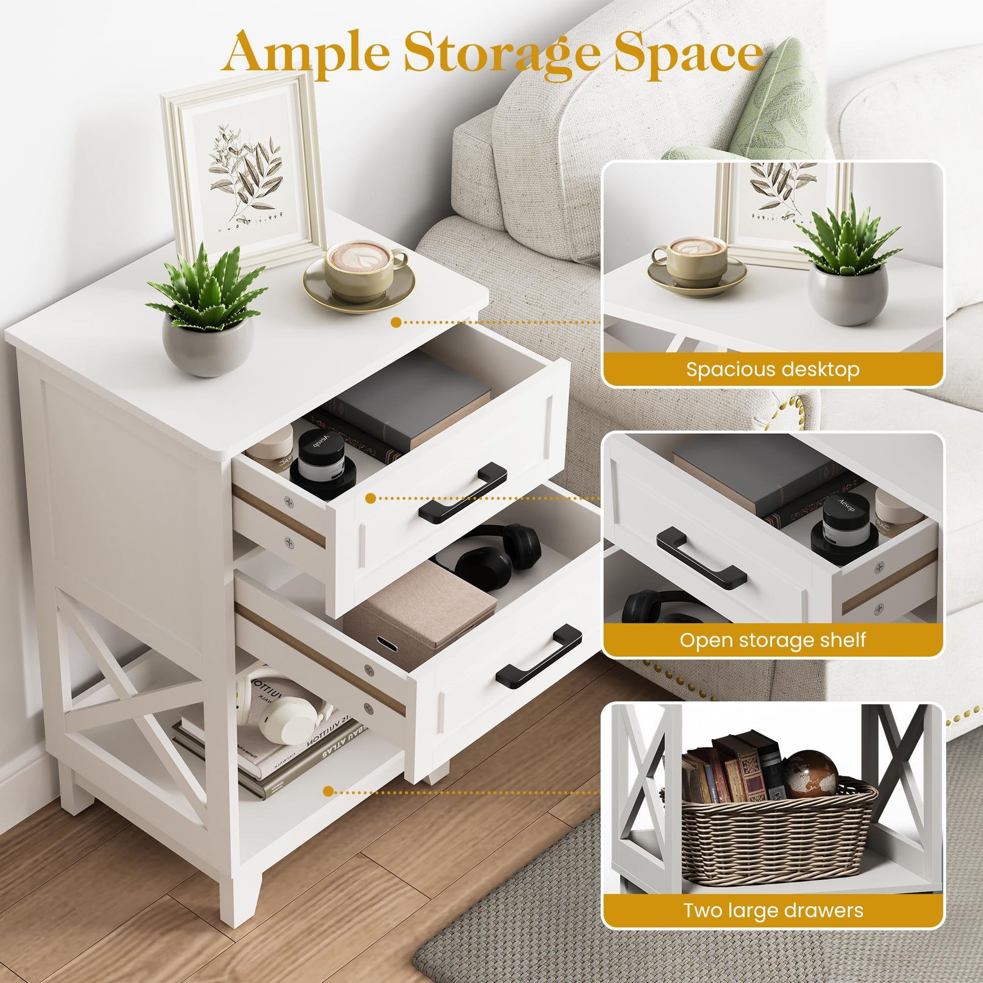 Our modern nightstand is an essential addition to elevate your home decor! This end table offers generous storage with two drawers and an open shelf, ensuring organized spaces and a tidy environment. Crafted from solid MDF material with a unique X-frame design, the side table guarantees stability and longevity to effortlessly meet your daily demands. The water-resistant painted surface ensures easy maintenance¡ªsimply wipe clean with a cloth. Its sleek and versatile design adapts perfectly as a bedside table or storage end table, ideal for bedrooms, living rooms, entryways.
