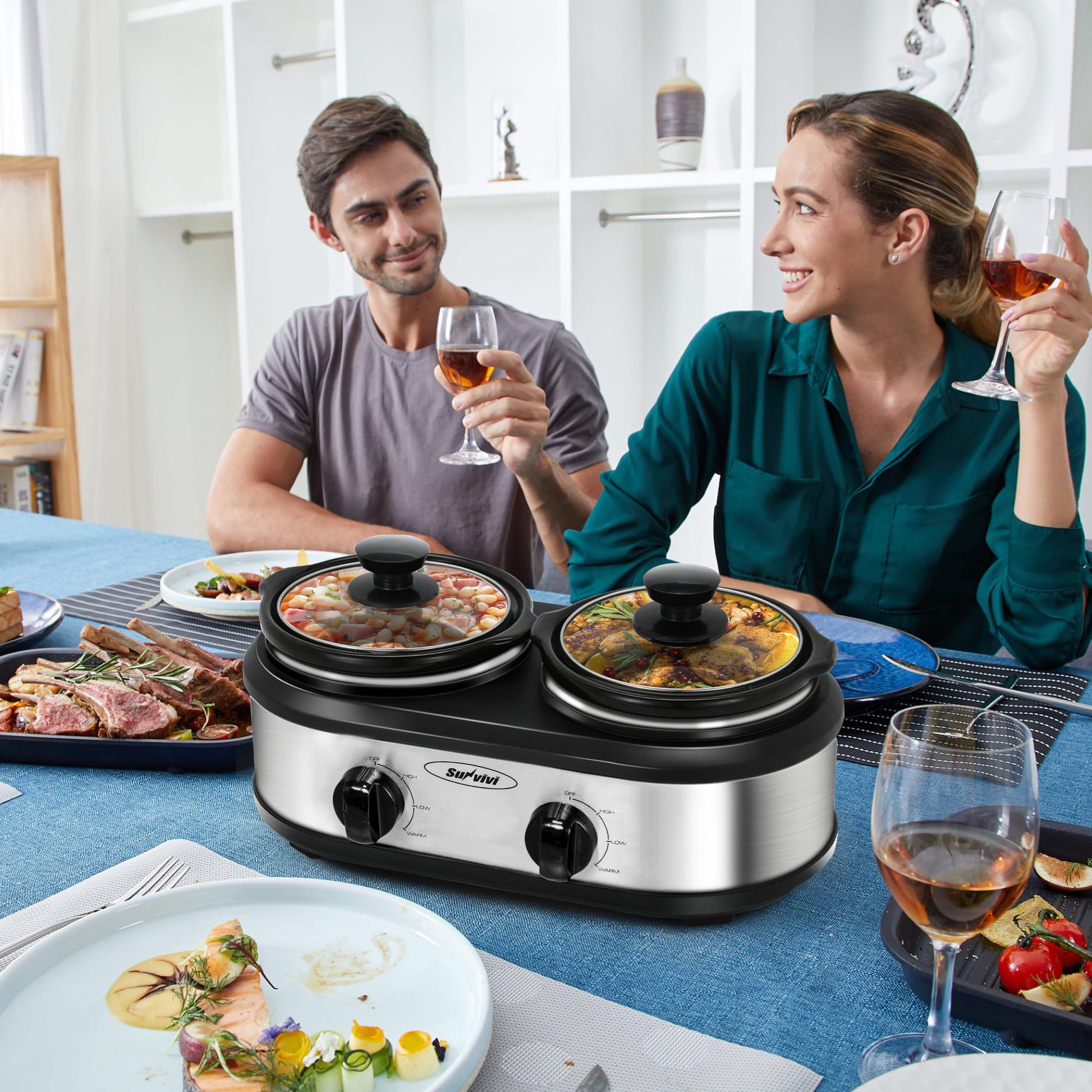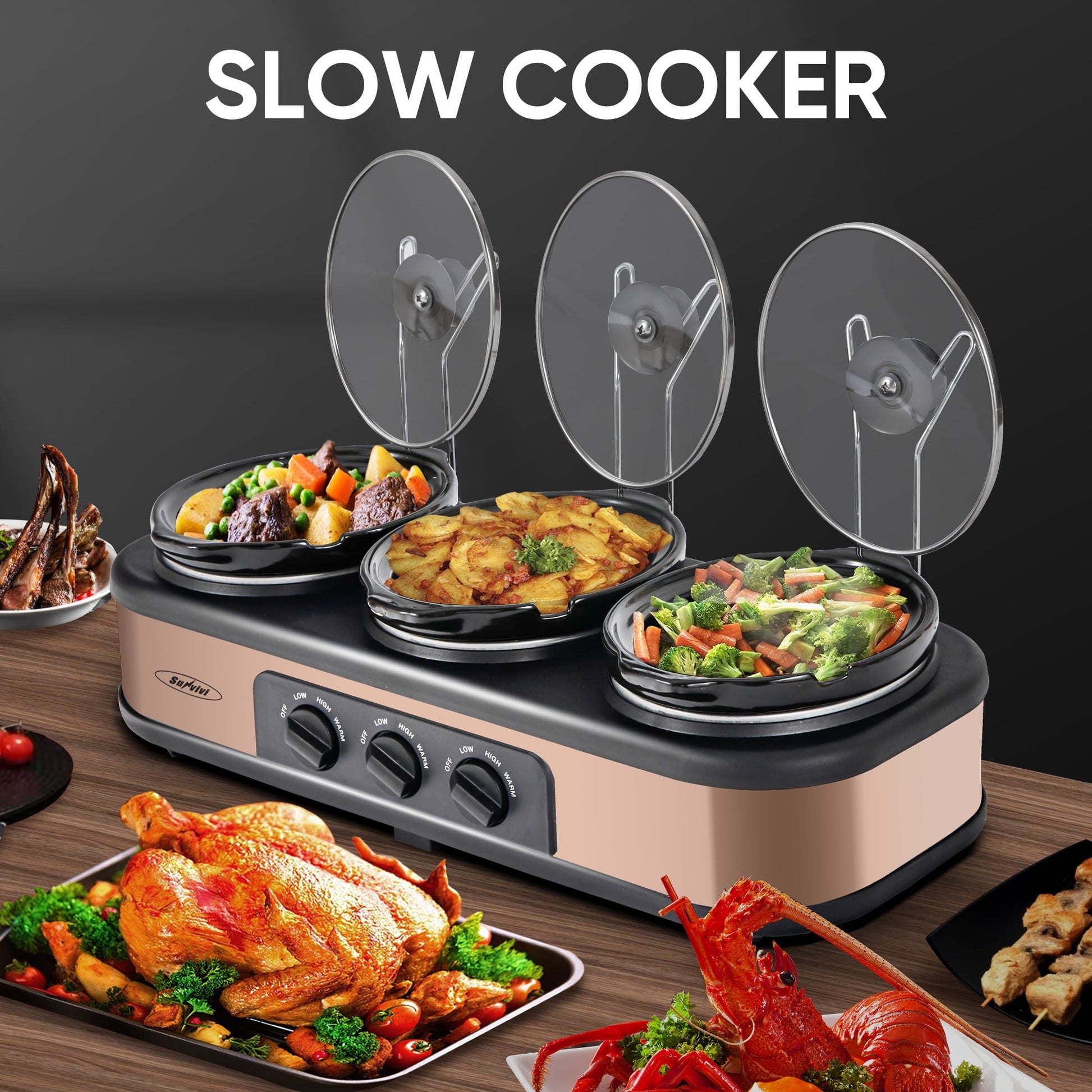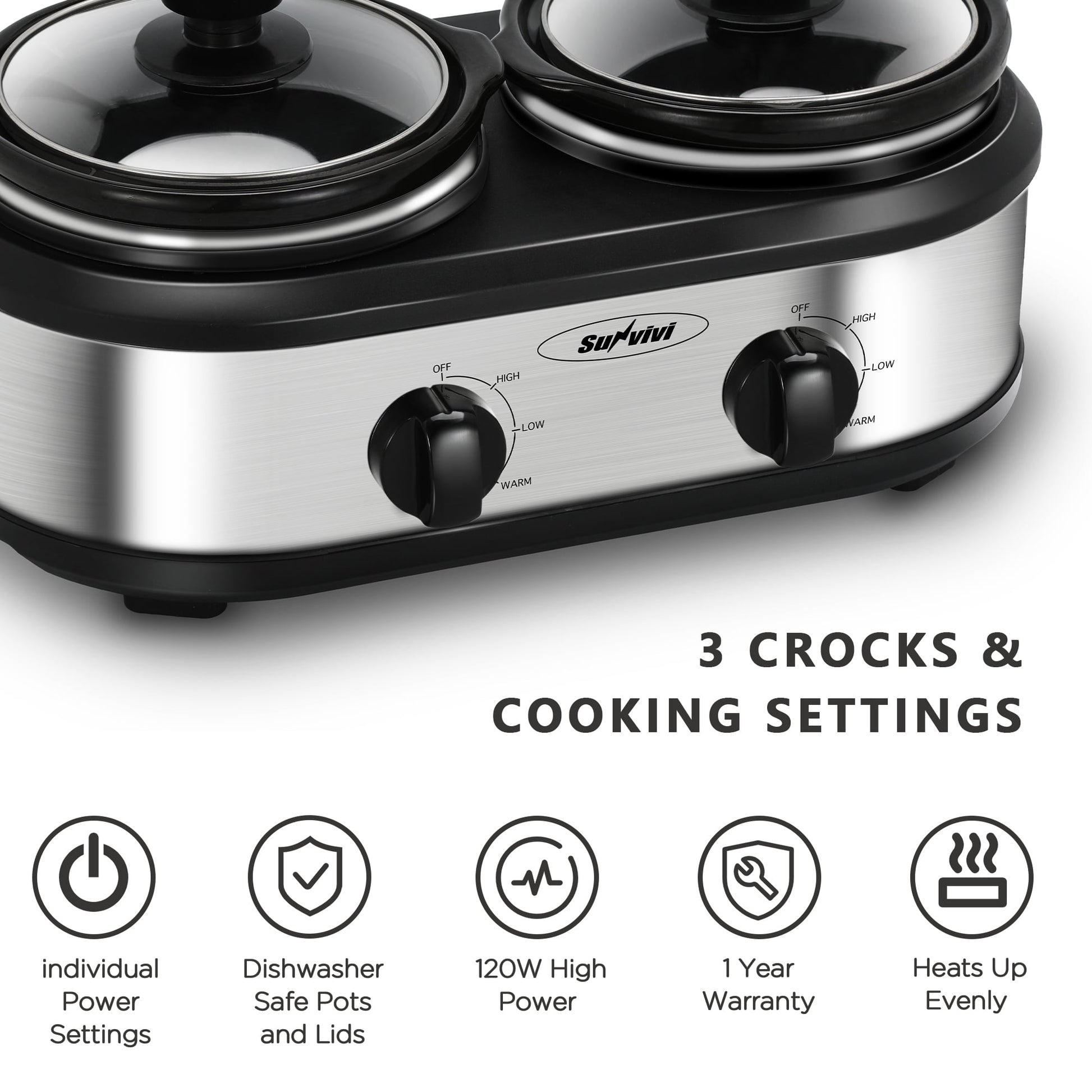 SUNVIVI double slow cooker is a kitchen appliance that can be used by anyone who enjoys cooking and wants to save time and energy. Two separate dishes can be prepared and served at the same time. Perfect for Meal sellers, Busy professionals and Health-consucious individuals. As a buffet warming server, it will be a welcome addition during any family gathering or holiday. The electric slow cooker features a non-stick, removable and stain proof stoneware crock insert ideal for easy prepping, serving and cleaning! There are 2 separate ceramic pots, allowing you to cook 2 different dishes at the same time. The two pot can be set to high, low temperature or keeping warm individually according to the ingredients you want to stew, ensuring your food cooked in the best cooking condition. The transparent lids allows you to view the condition of the food easily. The stainless steel pots are removable for easy cleaning. The lid and stoneware can be washed in the dishwasher or with hot, soapy water. This SUNVIVI 2 x 1.25 QT Crock Pot Food Warmer is ideal for office parties, family functions, and other social events, compact design perfect for camping, outdoors, etc..
