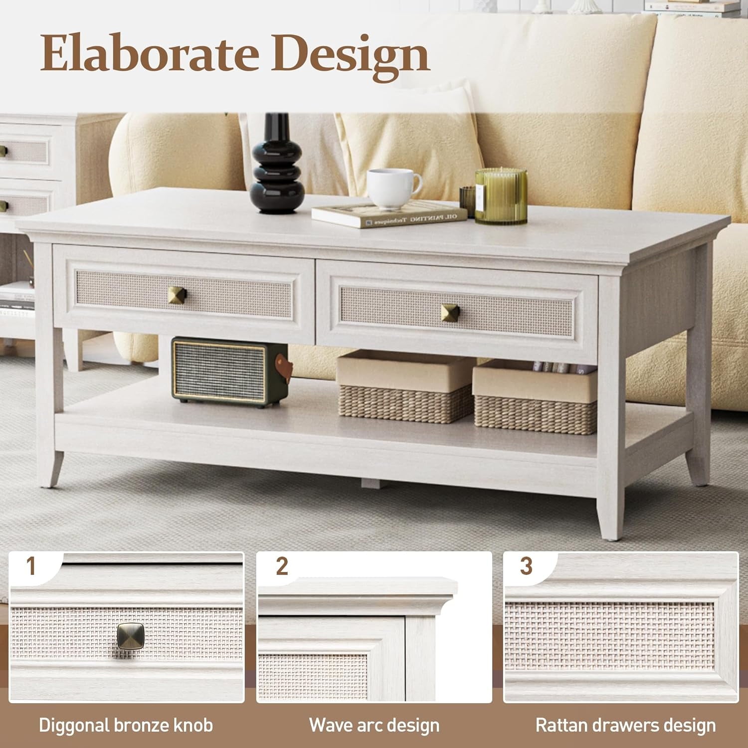 Superjoe 44" Rattan Farmhouse Grey Table with 2 Drawers, Boho 2 Tier Tea Table, Accent Center Sofa Table with Storage Shelf, Grayish White