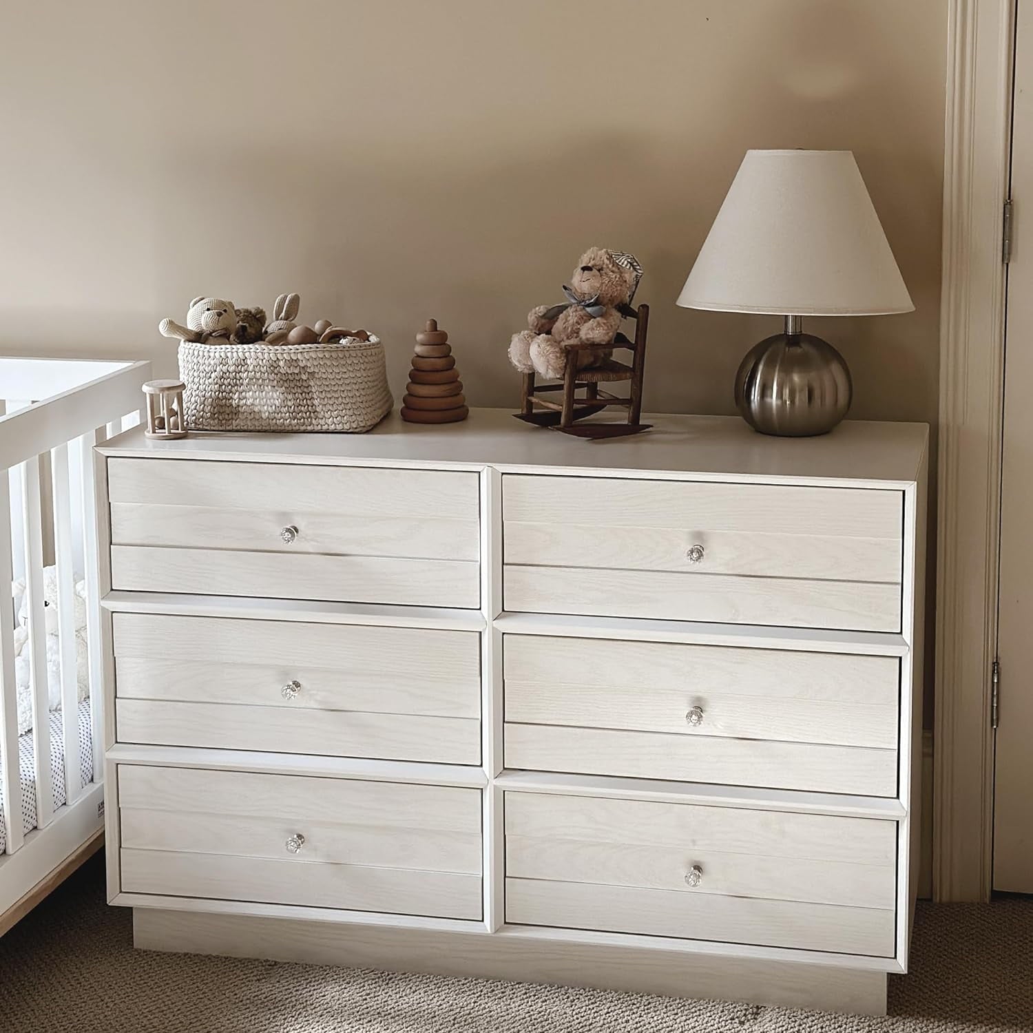 Superjoe 6 Drawer dresser features 45-degree beveled joint technology, crystal knobs, matte white lacquer strips, and a sturdy base to elevate your space. Ideal for bedrooms, closets, nurseries and living rooms. With six smooth-operating drawers, this solid wood chest of drawers features a compact and spacious design for efficient storage of clothing, accessories and personal items. This long drawer chest prioritizes your safety with an anti-tilt device and anti-pull-out mechanisms, coupled with reinforced drawer bottoms for additional support.