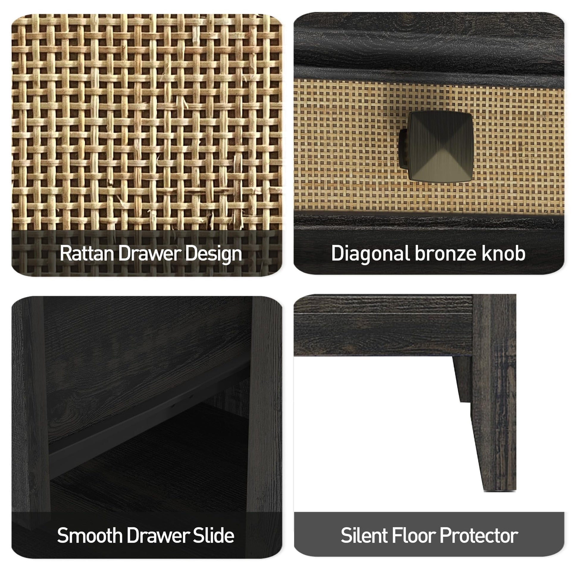 - Elegant Rattan Design: Crafted with wood grain panels and accented by natural rattan, the nightstand shows a charming boho-chic vibe. With diagonal bronze knobs for a unique look, it adds warmth and organic elegance to any space.