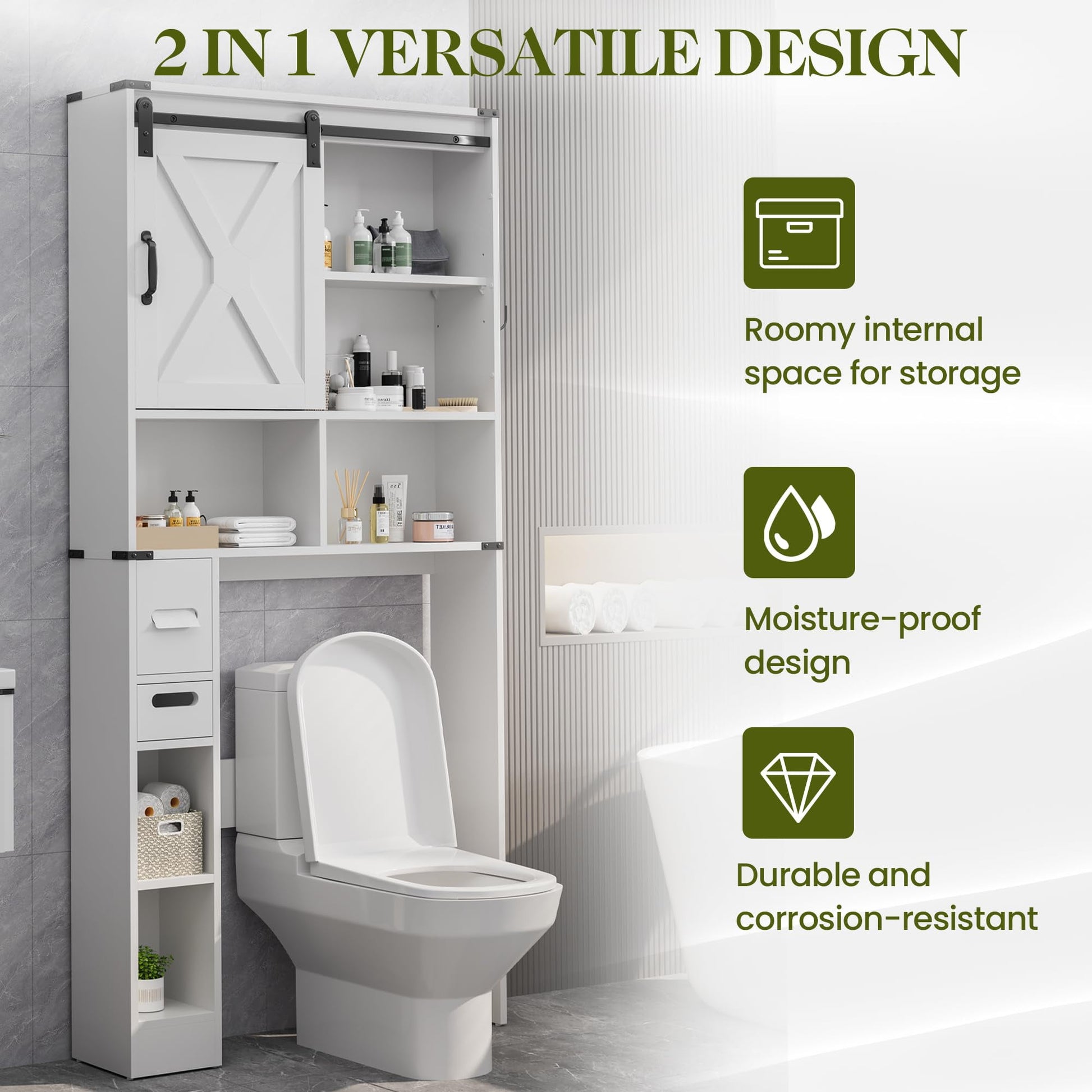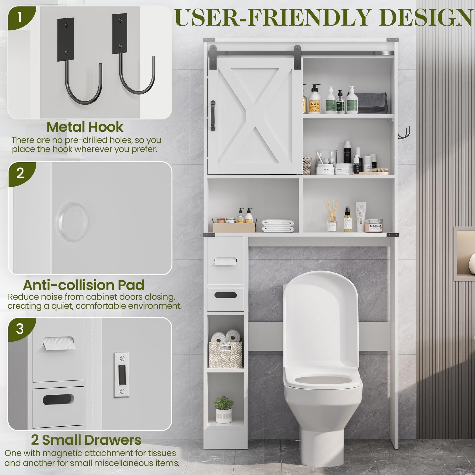 Superjoe Over The Toilet Storage Cabinet, Farmhouse Storage Cabinet Over Toilet with Sliding Barn Door, Home Space-Saving Toilet Rack, Behind Toilet Bathroom Organizer for Bathroom, White