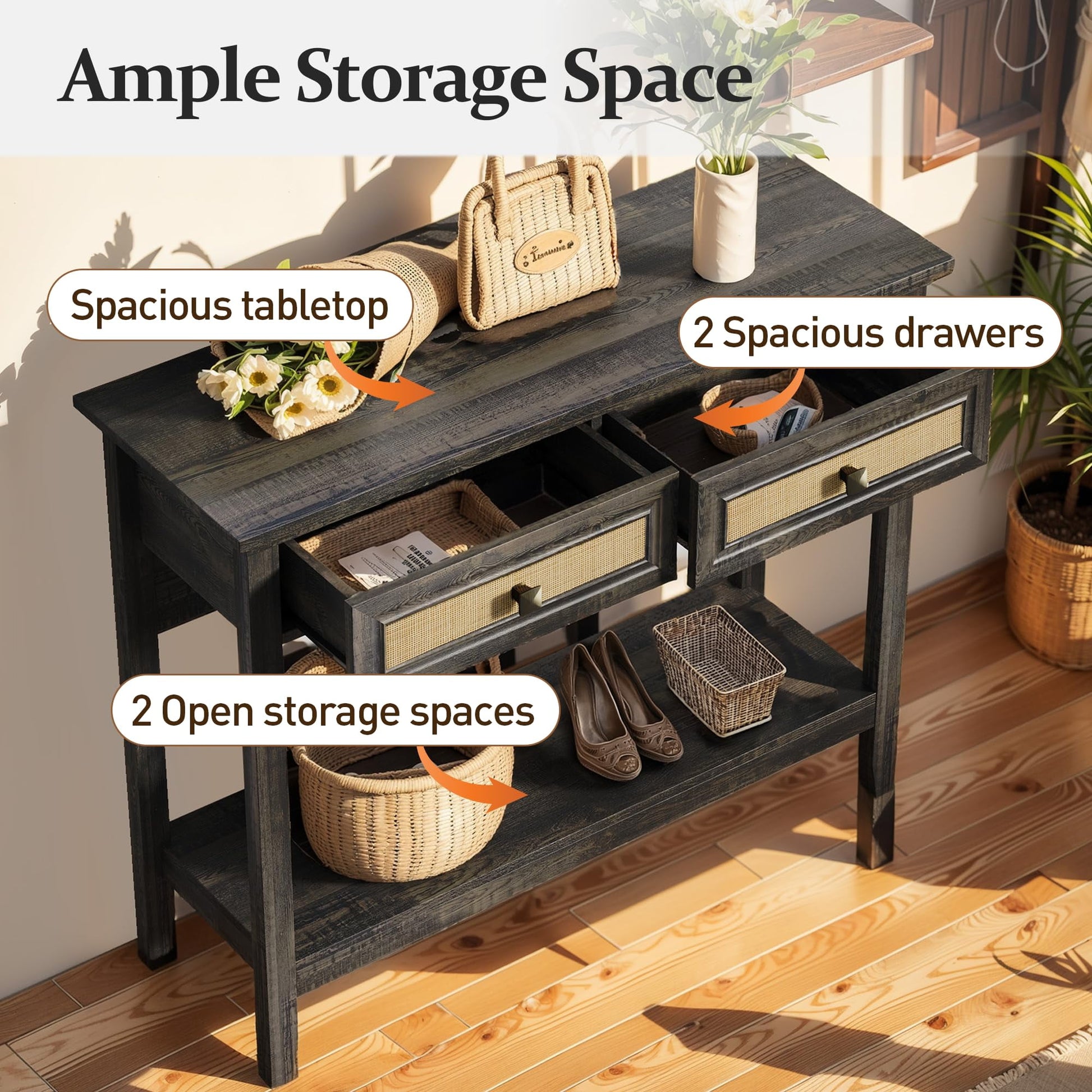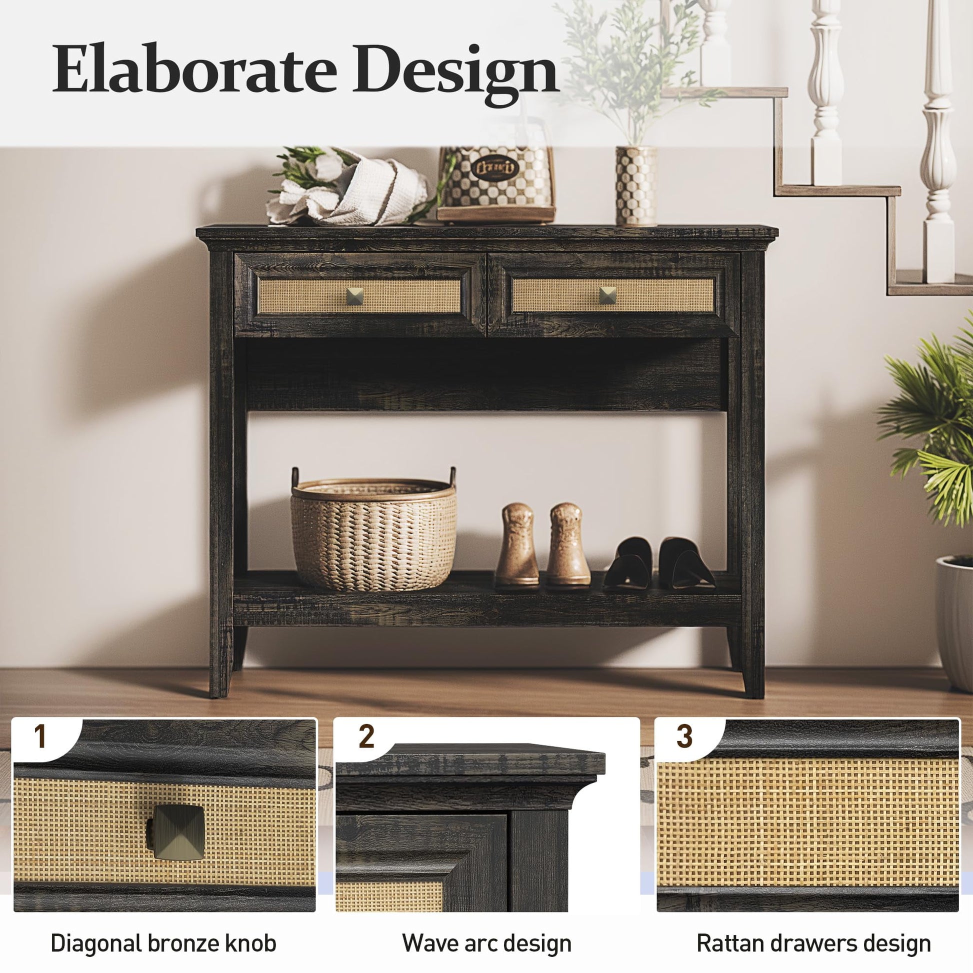 Superjoe Rattan Console Table, Boho Entryway Table with 2 Drawers and Storage Shelf, Long Wood Sofa Table for Living Room, Entryway, Front Hall, Hallway, Grey