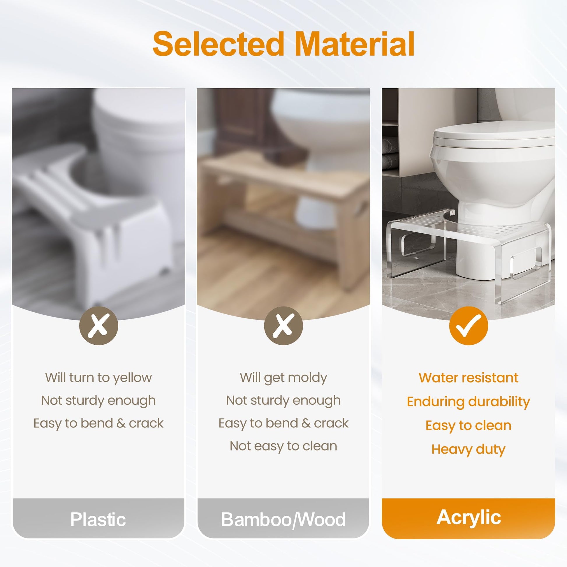 - Robust & Reliable: This pure acrylic stool is built for maximum durability with a thick, solid panel ensuring unmatched stability. Unlike wooden or bamboo stools, its waterproof design makes it ideal for damp areas, offering a reliable solution that maintains strength and performance in any condition.