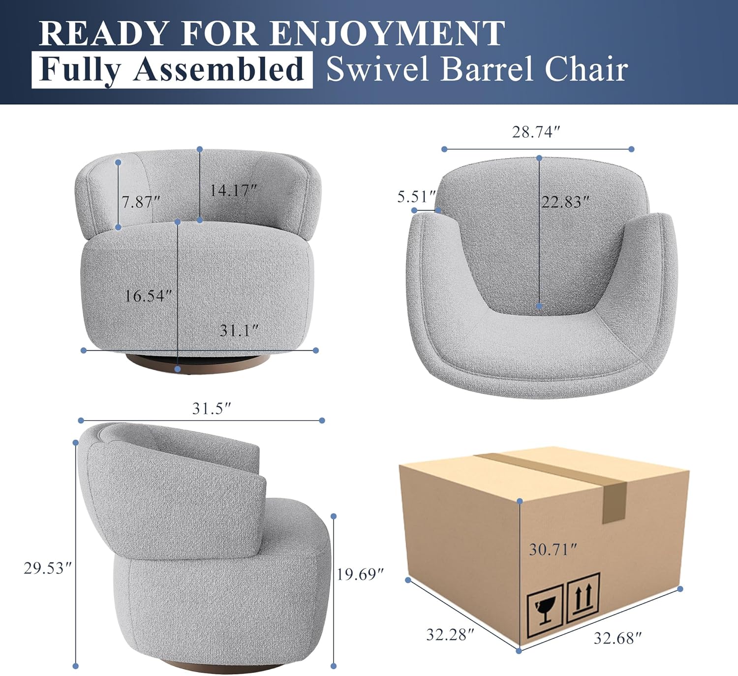 Swivel Accent Chair, Fully Assembled Round Barrel Chairs, Oversized Upholstered Armchair with 360-Degree Base, Modern Club Chair for Living Room, Bedroom, Office, Grey