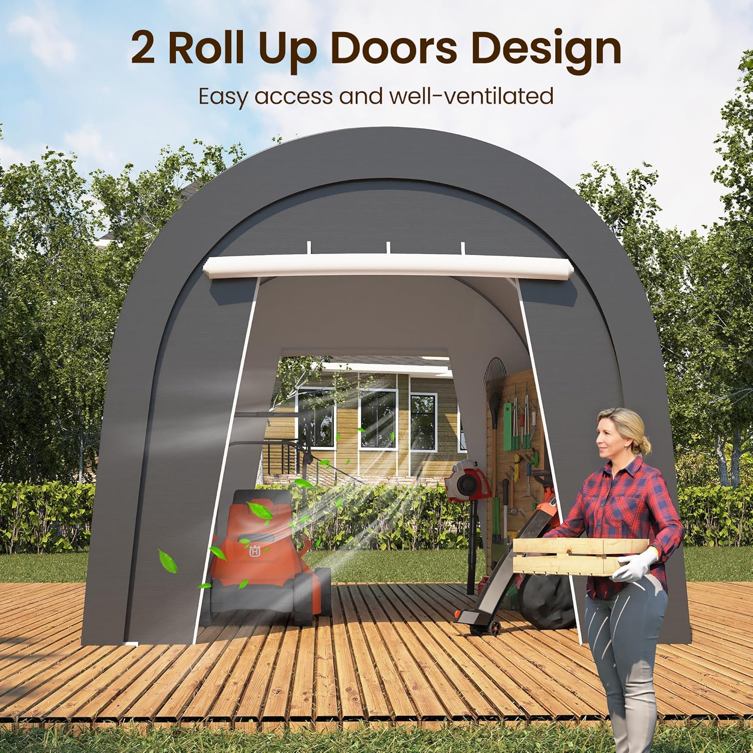 Enhanced Stability: Stay steady, rain or shine! With the addition of 4 cloth bags that can each hold up to 33 lbs of sand or gravel (filling not included), this carport becomes even more stable and anchored. It resists strong winds and heavy rain, prevents tipping, and keeps your outdoor space and stored items safe, secure, and well-protected in any weather.Build To Last: The heavy-duty steel frame and high-density PE fabric provide durability and stability. Elastic ball straps secure the canopy to the frame, while ground stakes keep the carport anchored, preventing shifting or tilting in strong winds or heavy rain. The tensioner ensures a stable structure, preventing loosening or wobbling.2 Roll-up Doors: The domed carport features two roll-up doors at the front and back, which can be closed or rolled up. Closing the doors to keep a dry environment inside, especially during rain or snow, while also increasing privacy. Rolling up the doors offers easy access, improves airflow, and lets in natural light, brightening the interior.Versatile Use: Our carport offers ample space for parking cars, trucks, motorcycles, RV, boat and more. It doubles as a storage area for firewood, lawnmowers, and other items, or as a workspace for repairs, or DIY projects. It also creates a sheltered area for family gatherings, barbecues, and picnics, keeping you protected from the weather.Easy Installation: Install the Portable Garage easily with no extra tools needed. Follow the simple, easy-to-understand manual, and two people can set it up quickly. Encounter any issues during installation or use? Reach out to us, and we¡¯ll resolve them promptly.Share